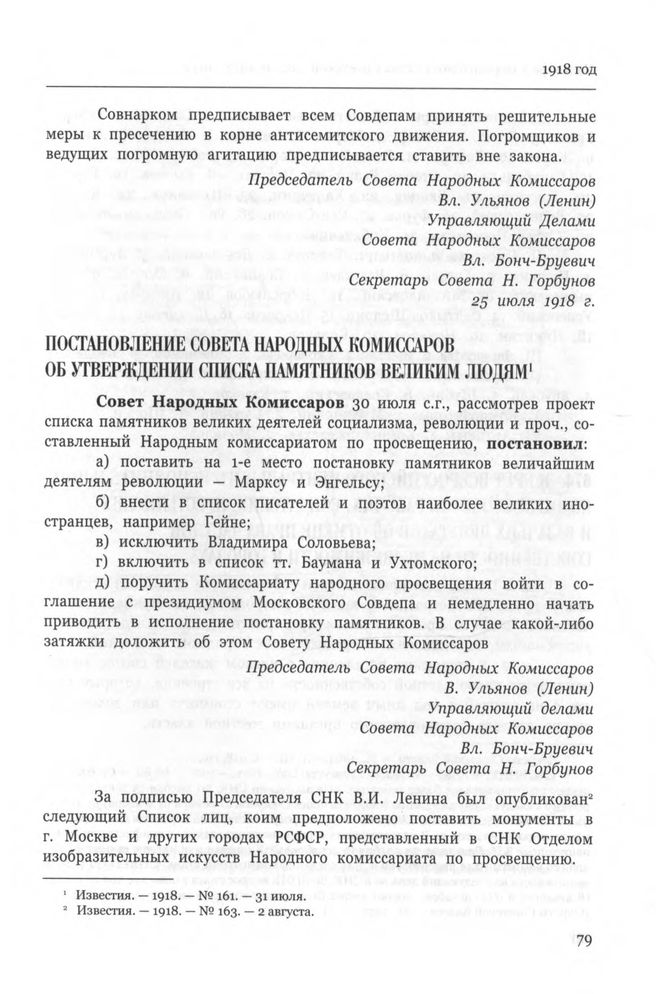 Постановление Совета Народных Комиссаров об утверждении списка памятников великим людям // Известия. — 1918. — № 161. — 31 июля.