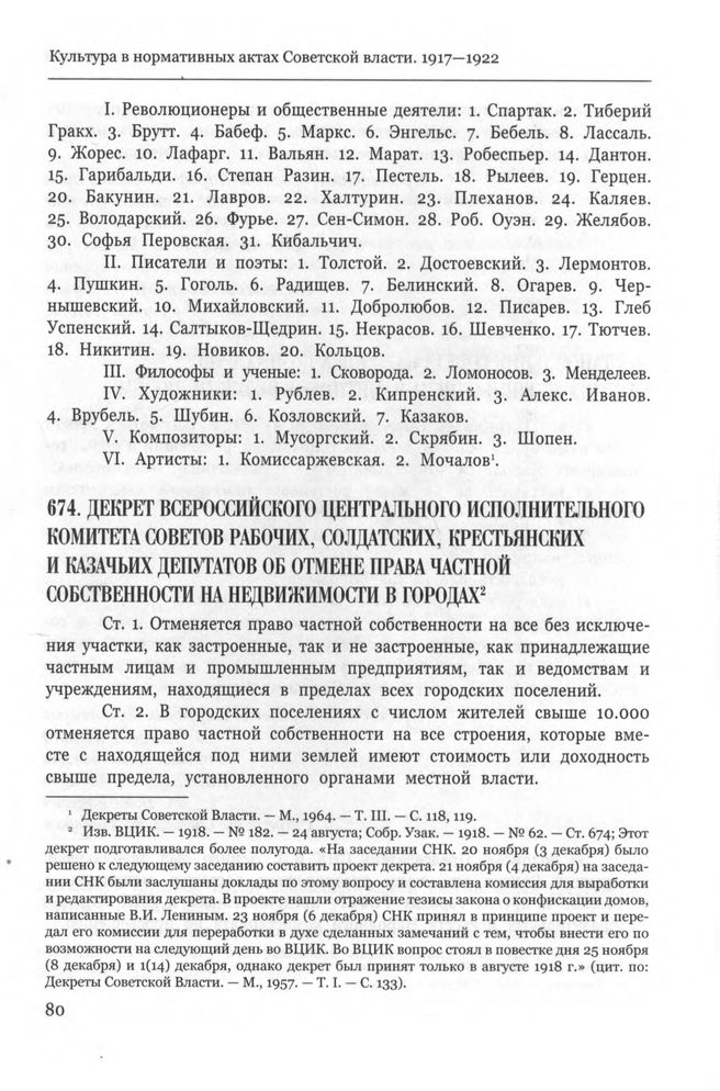 Декрет Всероссийского Центрального Исполнительного Комитета Советов Рабочих, Солдатских, Крестьянских и Казачьих Депутатов об отмене права частной собственности на недвижимости в городах. 20 августа 1918 года // Изв. ВЦИК. — 1918. — № 182. — 24 августа; Собр. Узак. — 1918. — № 62. — Ст. 674;