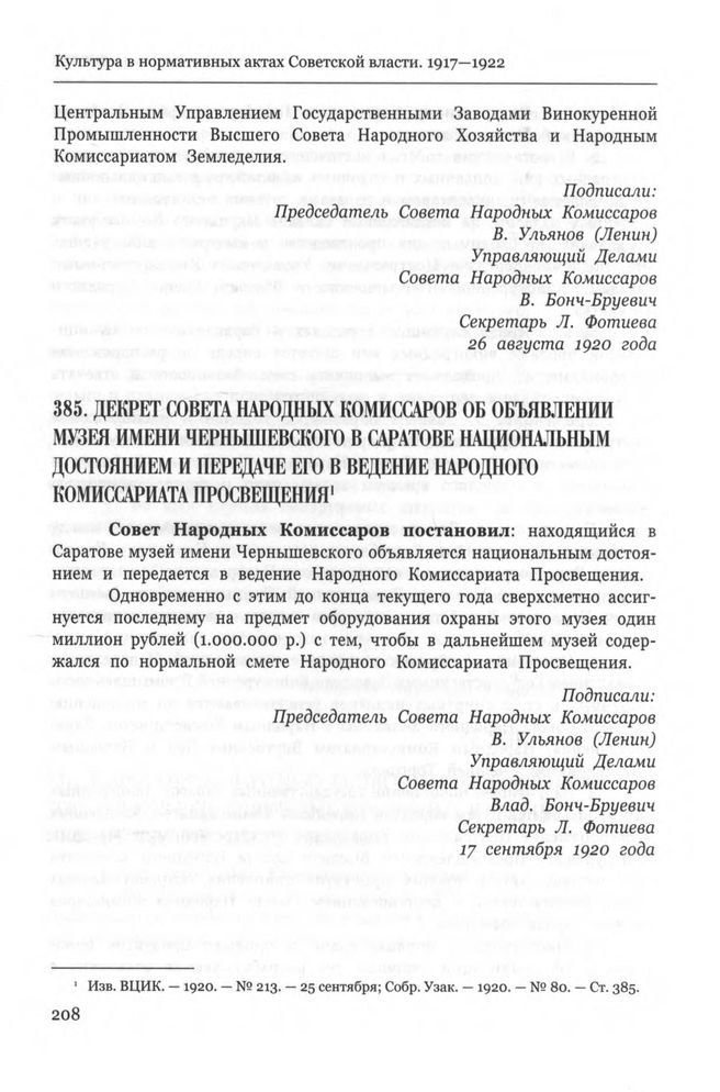 Декрет Совета Народных Комиссаров об объявлении музея имени Чернышевского в Саратове национальным достоянием и передаче его в ведение Народного Комиссариата Просвещения. 17 сентября 1920 г. // Изв. ВЦИК. — 1920. — № 213. — 25 сентября; Собр. Узак. — 1920. — № 80. — Ст. 385.