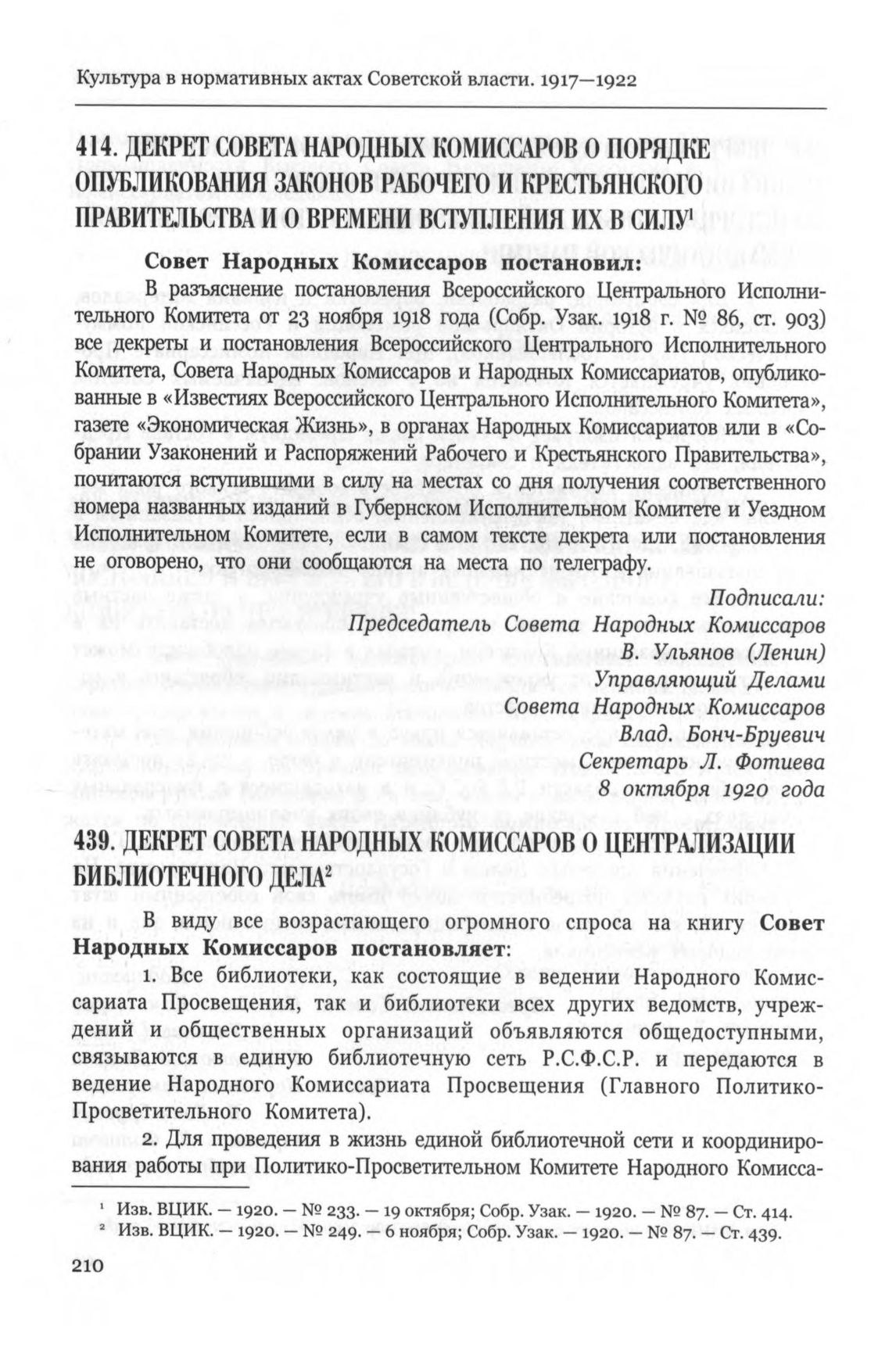 Декрет Совета Народных Комиссаров о централизации библиотечного дела. 3 ноября 1920 г. // Изв. ВЦИК. — 1920. — № 249. — 6 ноября; Собр. Узак. — 1920. — № 87. — Ст. 439.