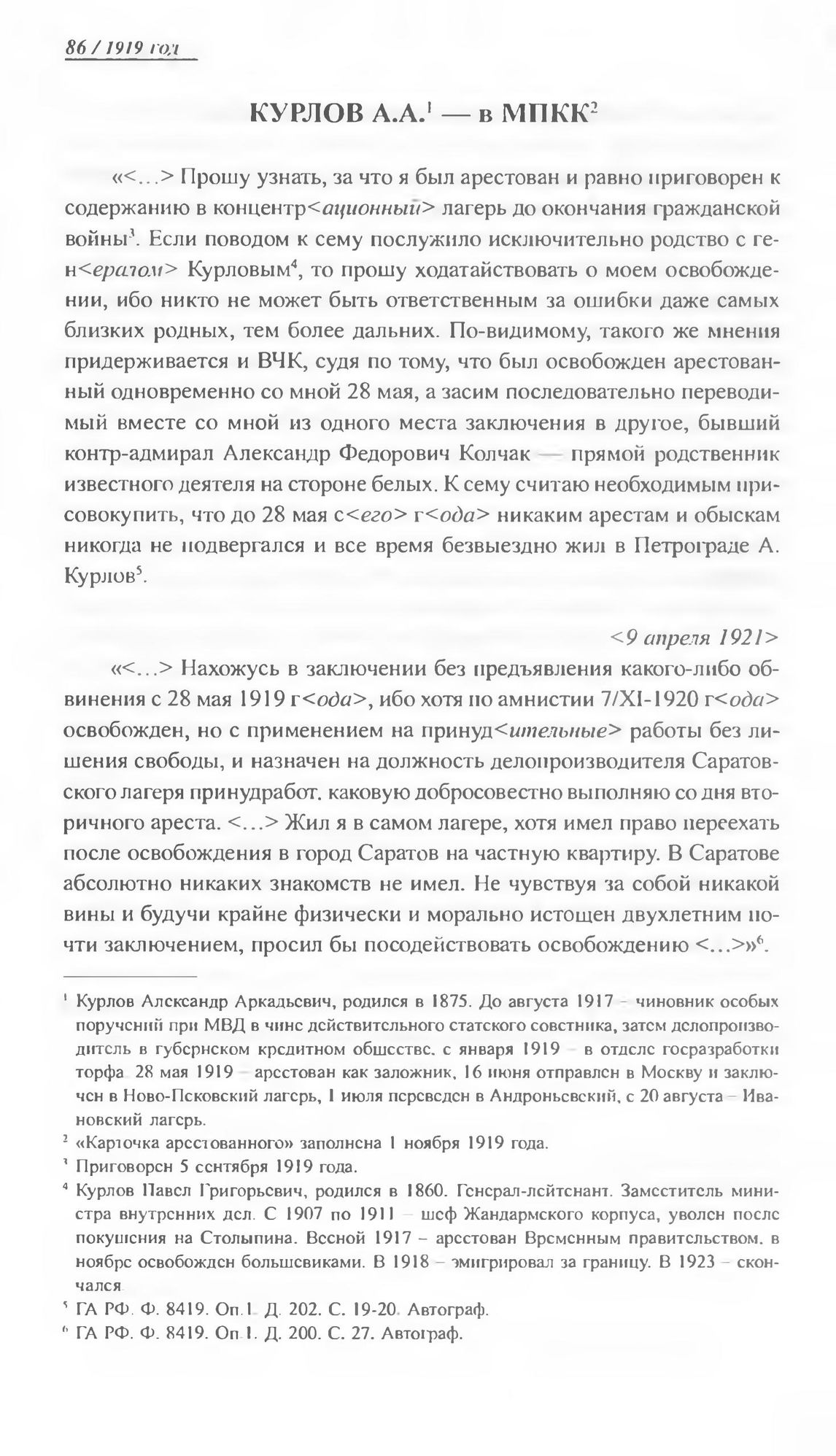 Курлов А.А. — в МПКК. Карточка арестованного. 1 ноября 1919 г. // ГА РФ. Ф. 8419. Оп. 1. Д. 202. С. 19-20. Автограф.