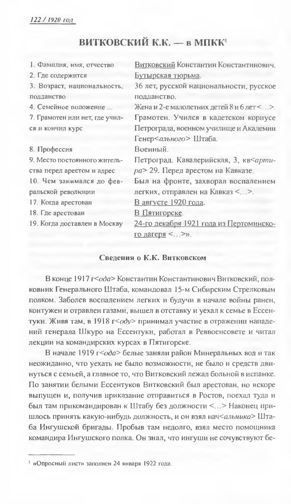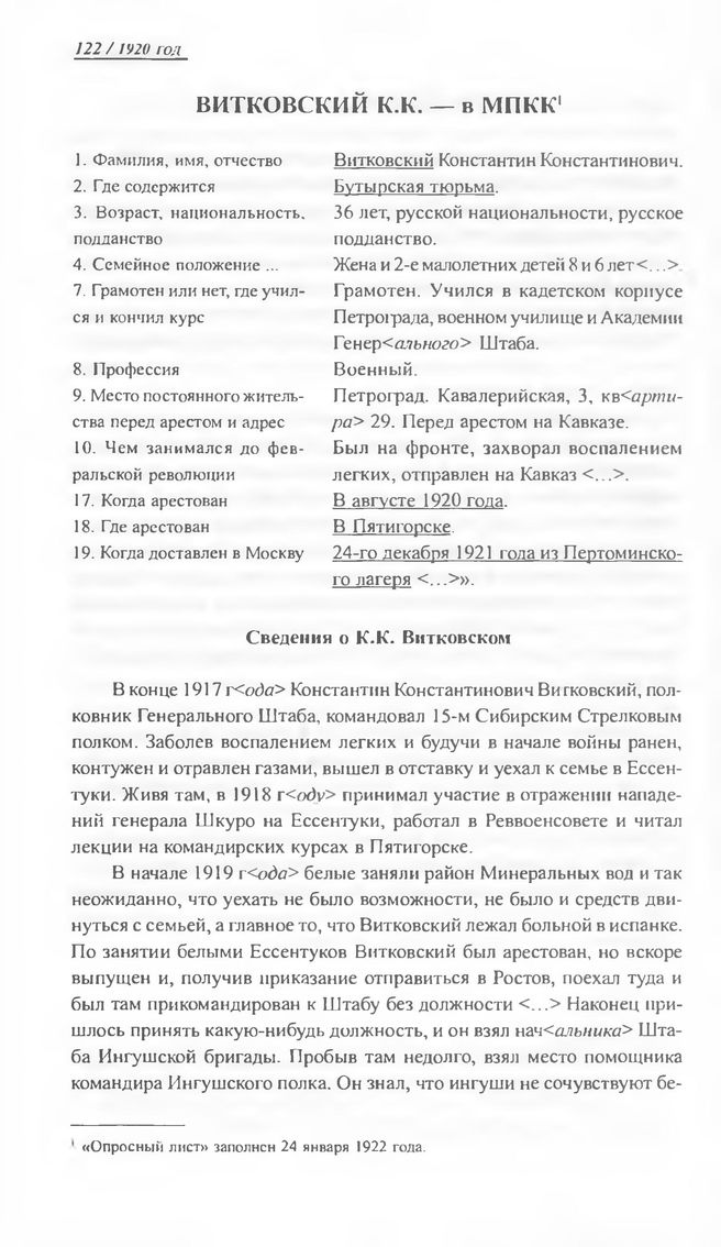 Витковский К.К. — в МПКК. Опросный лист и сведения. 24 января 1922 г.