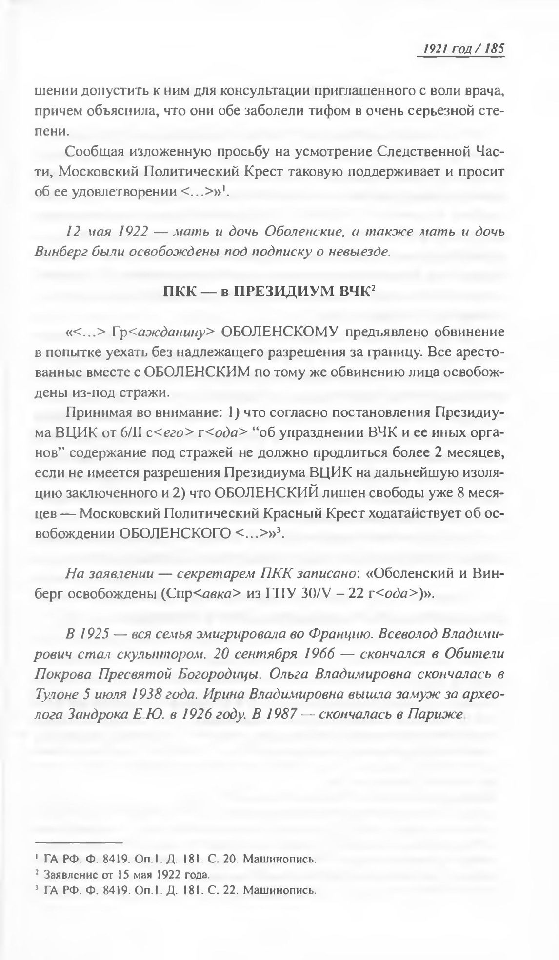 Оболенский В.В. ПКК — в Президиум ВЧК. Заявление от 15 мая 1922 г. // ГА РФ. Ф. 8419. Оп. 1. Д. 181. С. 22. Машинопись.
