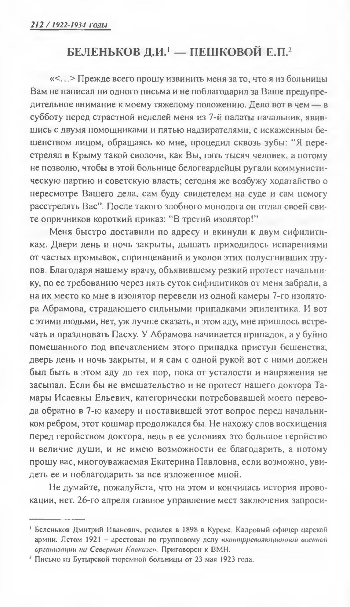 Беленьков Д.И. — Пешковой Е.П. Письмо из Бутырской тюремной больницы от 23 мая 1923 г. // ГА РФ. Ф. 8409. Oп. 1. Д. 8. С. 87-90. Автограф.