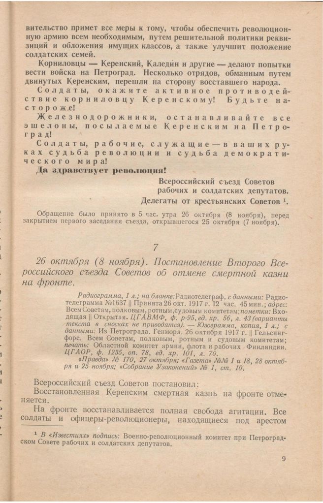 26 октября (8 ноября). Постановление Второго Всероссийского съезда Советов об отмене смертной казни на фронте // Радиограмма, 1 л.; на бланке: Радиотелеграф, сданными: Радиотелеграмма №1637 || Принята 26 окт. 1917 г. 12 час. 45 мин. адрес: Всем Советам, полковым, ротным, судовым комитетам - пометки: Входящая || Открытая. ЦГАВМФ , ф. р-95, ед. хр. 56, л. 43 (варианты текста в сносках не приводятся). — Юзограмма, копия, 1 л.; с данными: Из Петрограда. Генмора. 20 октября 1917 г. || Гельсингфорс. Всем Советам, полковым, ротным и судовым комитетам; печать: Областной комитет армии, флота и рабочих Финляндии. ЦГАОР, ф.1235, оп. 78, ед. хр. 101, л. 70. «Правда» № 170, 27 октября; «Газета» №№ 1 и 18, 28 октября и 25 ноября; «Собрание Узаконений» № 1, ст. 10.