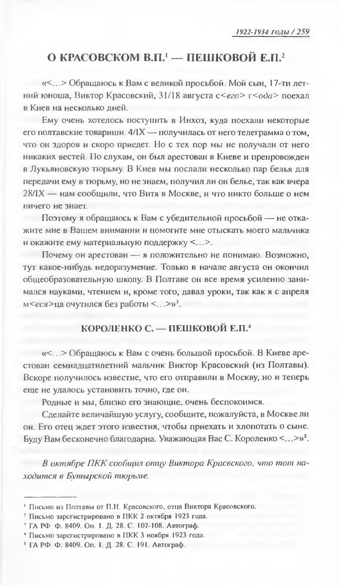 О Красовском В.П. — Пешковой Е.П. Письмо из Полтавы. 2 октября 1923 г. // ГА РФ. Ф. 8409. Оп. 1. Д. 28. С. 107-108. Автограф.