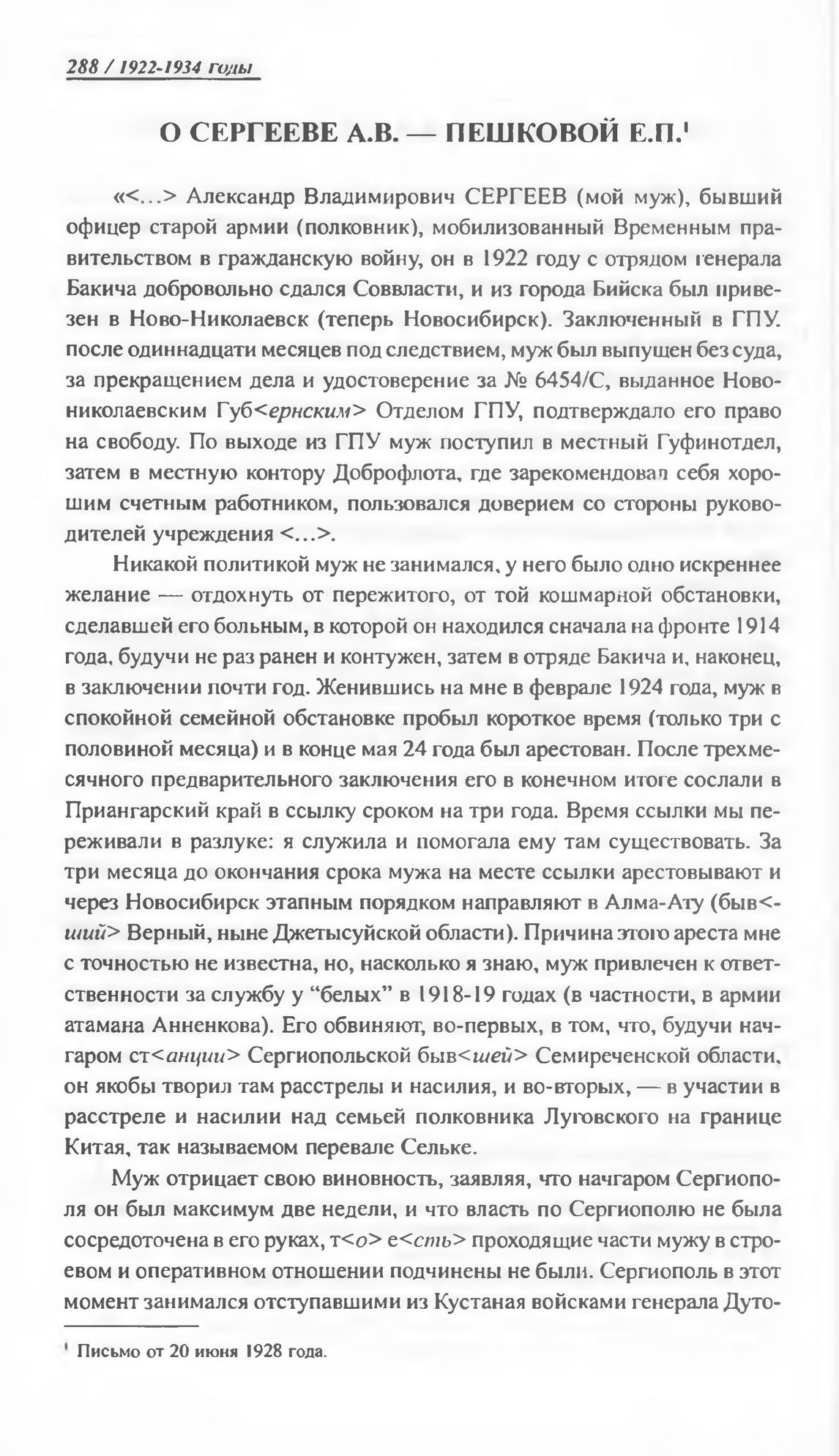 О Сергееве А.В. — Пешковой Е.П. Письмо от 20 июня 1928 г.