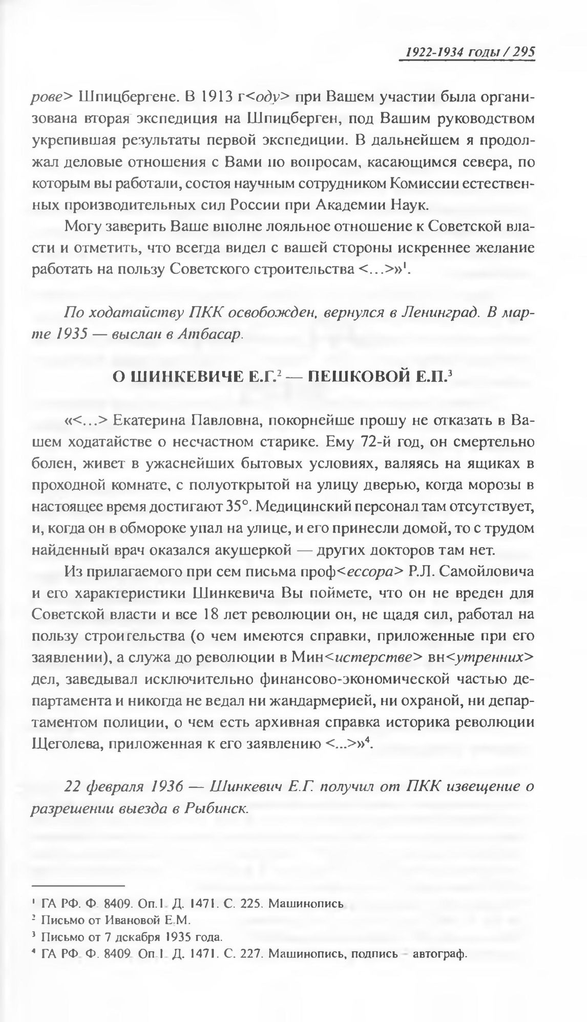 О Шинкевиче Е.Г. — Пешковой Е.П. Письмо от 7 декабря 1935 г. // ГА РФ. Ф. 8409. Oп. 1. Д. 1471. С. 227. Машинопись, подпись автограф.
