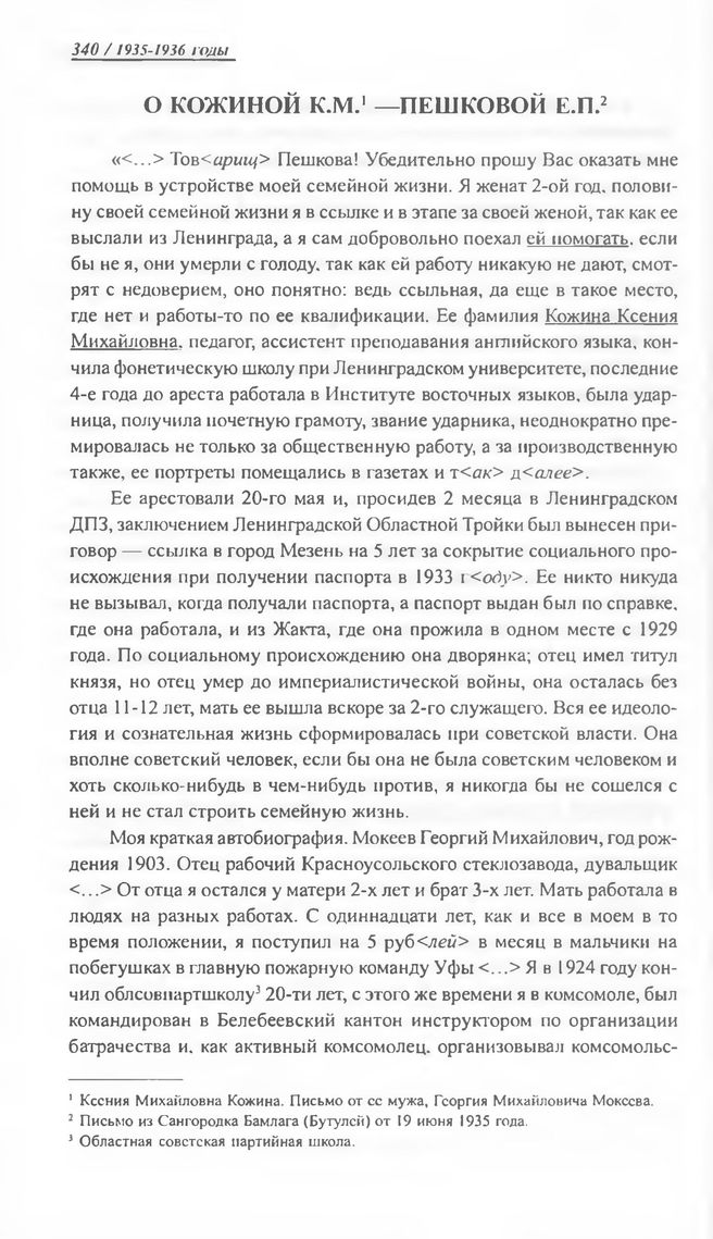 О Кожиной К.М. — Пешковой E.П. Письмо из Сангородка Бамлага (Бутулей) от 19 июня 1935 г. // ГА РФ. Ф. 8409. Oп. 1. Д. 1336. С. 66-67. Автограф.