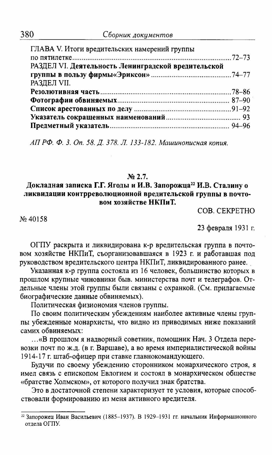 Докладная записка Г.Г. Ягоды и И.В. Запорожца И.В. Сталину о ликвидации контрреволюционной вредительской группы в почтовом хозяйстве НКПиТ. 23 февраля 1931 г. // АП РФ. Ф. 3. Oп. 58. Д. 378. Л. 83-194. Подлинник.