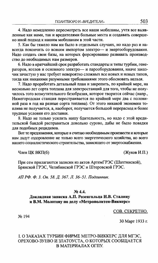 Докладная записка А.П. Розенгольца И.В. Сталину и В.М. Молотову по делу «Метрополитен-Виккерс». 30 Март 1933 г. // АП РФ. Ф. 3. Oп. 58. Д. 367. Л. 58-64. Подлинник.