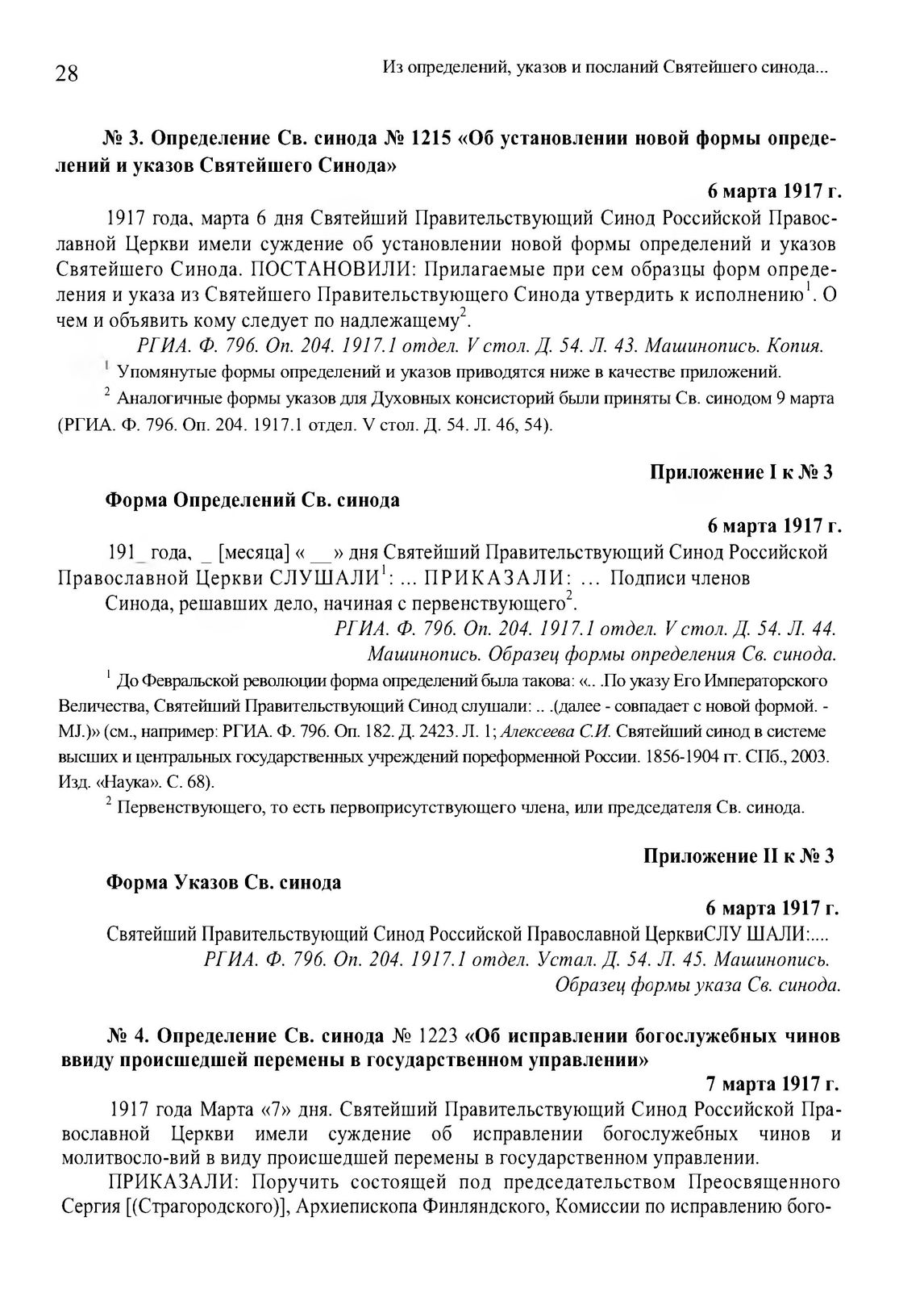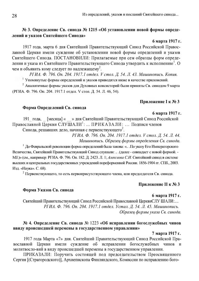 Определение Св. синода № 1215 «Об установлении новой формы определений и указов Святейшего Синода». 6 марта 1917 г. // РГИА. Ф. 796. Оп. 204. 1917. 1 отдел. V стол. Д. 54. Л. 43. Машинопись. Копия.