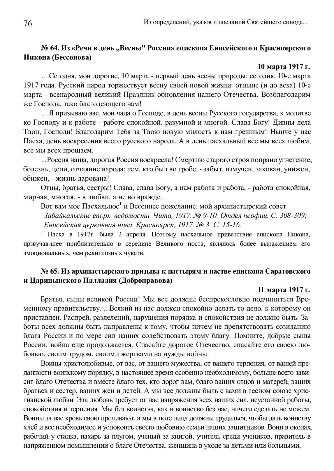 Из «Речи в день „Весны" России» епископа Енисейского и Красноярского Никона (Бессонова). 10 марта 1917 г. // Забайкальские епарх. ведомости. Чита, 1917. № 9-10. Отдел неофиц. С. 308-309; Енисейская церковная нива. Красноярск, 1917. № 3. С. 15-16.