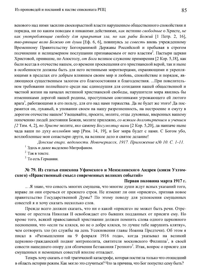 Из статьи епископа Уфимского и Мензелинского Андрея (князя Ухтомского) «Нравственный смысл современных великих событий». Первая половина марта 1917 г. // Уфимские епарх. ведомости. Уфа, 1917. № 5-6. Отдел неофиц. С. 138-139; Нижегородский церк.-обществ. вестник. Н.-Новгород, 1917. № 10. С. 163; Церковная правда. Симбирск, 1917. № 1. С. 2; Петроградский листок. Пг., 1917. № 85. С. 2; Астраханский вестник. Астрахань, 1917. № 63. С. 2.