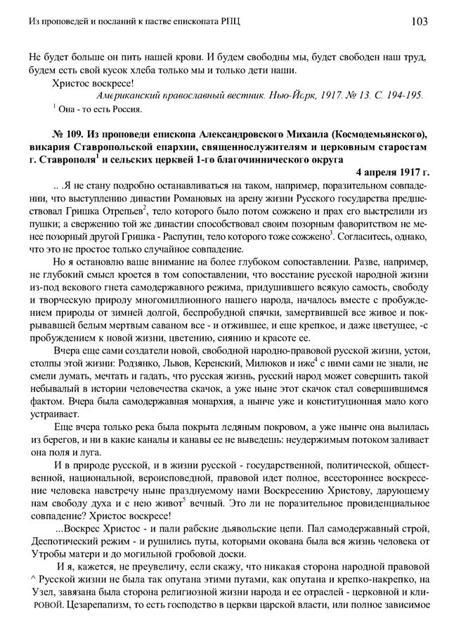 Из проповеди епископа Александровского Михаила (Космодемьянского), викария Ставропольской епархии, священнослужителям и церковным старостам г. Ставрополя и сельских церквей 1-го благочиннического округа. 4 апреля 1917 г. // Ставропольские епарх. ведомости. Ставрополь, 1917. № 21. Отдел неофиц. С. 638-643.