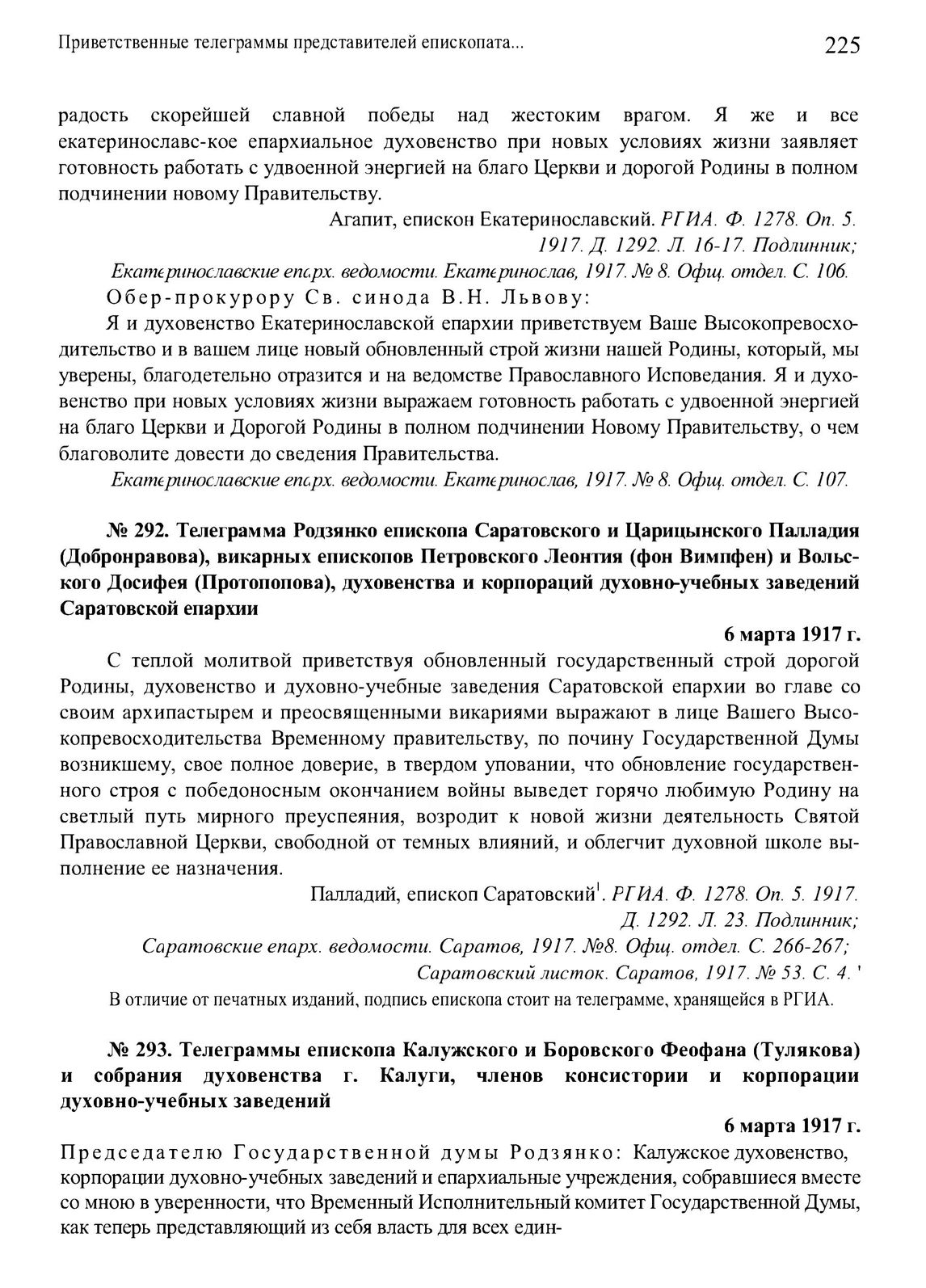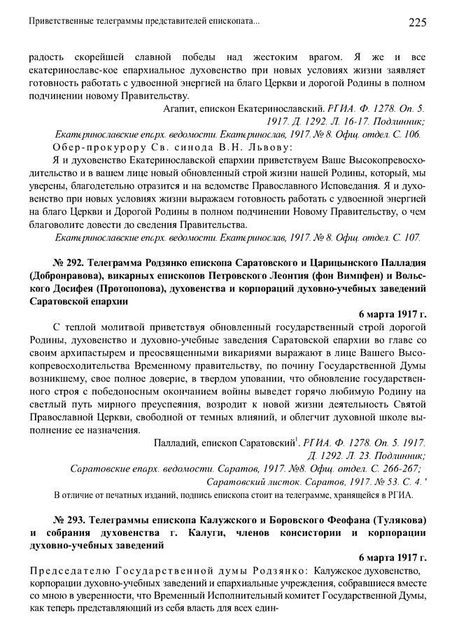Телеграммы епископа Калужского и Боровского Феофана (Туликова) и собрания духовенства г. Калуги, членов консистории и корпорации духовно-учебных заведений. 6 марта 1917 г. Председателю Государственной думы Родзянко // РГИА. Ф. 1278. Oп. 5. 1917. Д. 1292. Л. 20. Подлинник; Калужский церк.-обществ. вестник. Калуга, 1917. № 8-9. С. 5-6.