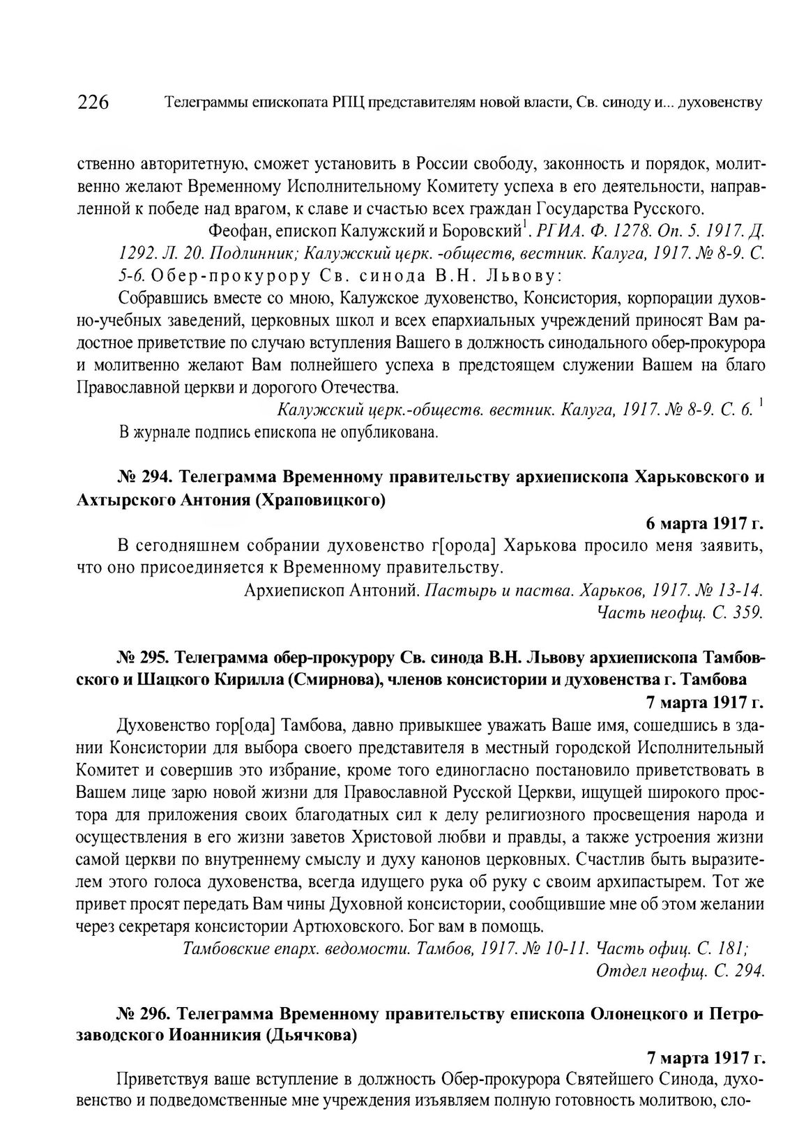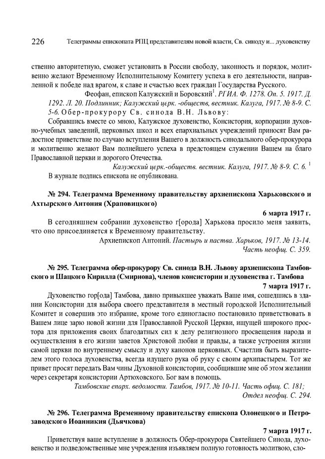 Телеграмма обер-прокурору Св. синода В.Н. Львову архиепископа Тамбовского и Шацкого Кирилла (Смирнова), членов консистории и духовенства г. Тамбова. 7 марта 1917 г. // Тамбовские епарх. ведомости. Тамбов, 1917. № 10-11. Частъ офиц. С. 181; Отдел неофиц. С. 294.