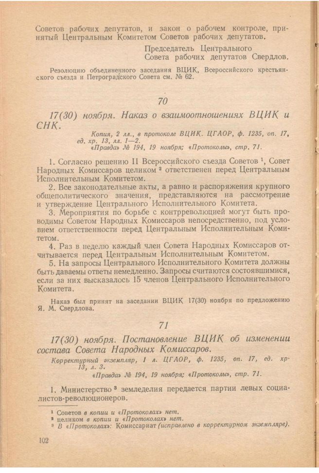 17 (30) ноября. Наказ о взаимоотношениях ВЦИК и СНК // Копия, 2 лл., в протоколе ВЦИК. ЦГАОР, ф. 1235, оп. 17, ед. хр. 13, лл. 1—2. «Правда» № 194, 19 ноября; «Протоколы», стр. 71.