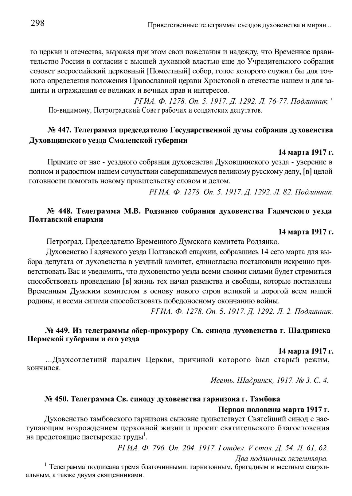 Из телеграммы обер-прокурору Св. синода духовенства г. Шадринска Пермской губернии и его уезда. 14 марта 1917 г. // Исеть. Шадринск, 1917. № 3. С. 4.