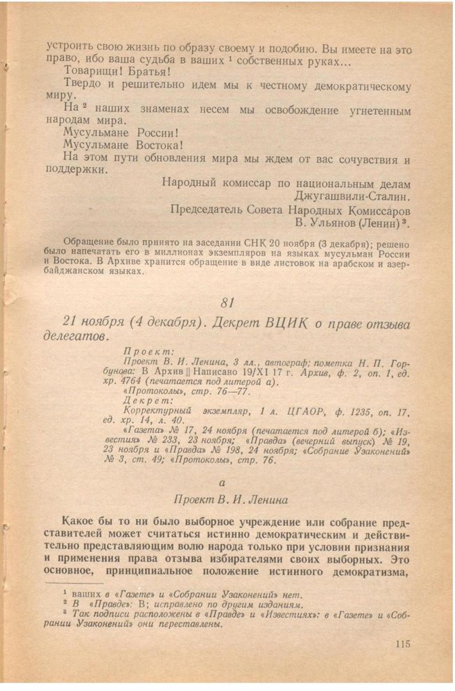 Главная Серия «Экономическая история. Документы, исследования, переводы» Декреты советской власти в 18 т. Декреты Советской власти. Т. I. 25 октября 1917 г. – 16 марта 1918 г. Документы 21 ноября (4 декабря). Декрет ВЦИК о праве отзыва делегатов