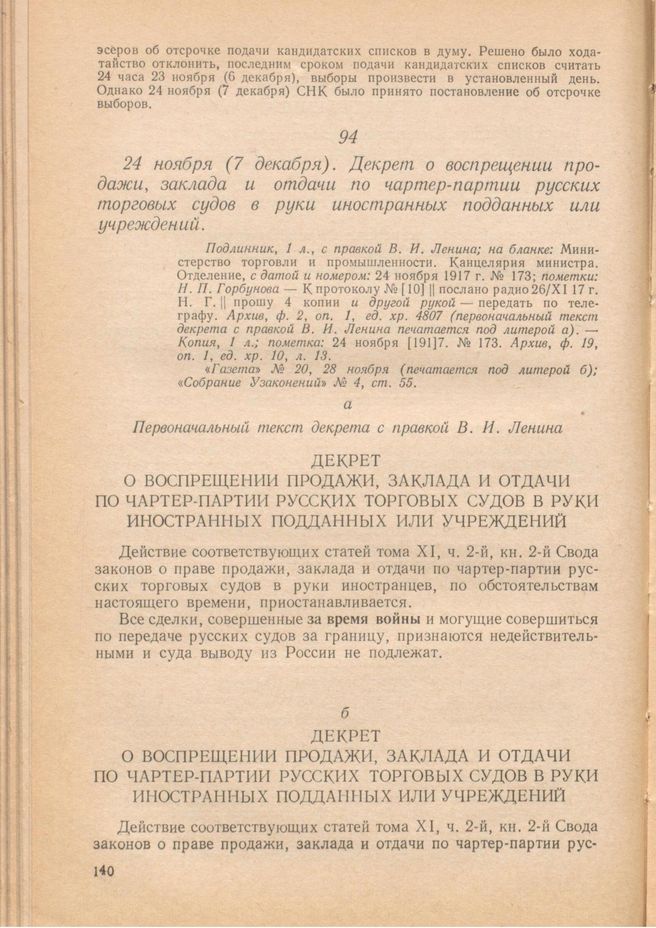 24 ноября (7 декабря). Декрет о воспрещении продажи, заклада и отдачи по чартер-партии русских торговых судов в руки иностранных подданных или учреждений // Подлинник, 1 л., с правкой В. И. Ленина; на бланке: Министерство торговли и промышленности. Канцелярия министра. Отделение, с датой и номером: 24 ноября 1917 г. № 173; пометки: || 17. Горбунова — К протоколу № [10] ||послано радио 20/Х1 17 г. Н. Г. || прошу 4 копии и другой рукой — передать по телеграфу. Архив, ф. 2, оп. 1, ед. хр. 4807 (первоначальный текст декрета с правкой В. И. Ленина печатается под литерой а). — Копия, 1 л.; пометка: 24 ноября [191]7. № 173. Архив, ф. 19, оп. 1, ед. хр. 10, л. 13. «Газета» № 20, 28 ноября (печатается под литерой б); «Собрание Узаконений» № 4, ст. 55.