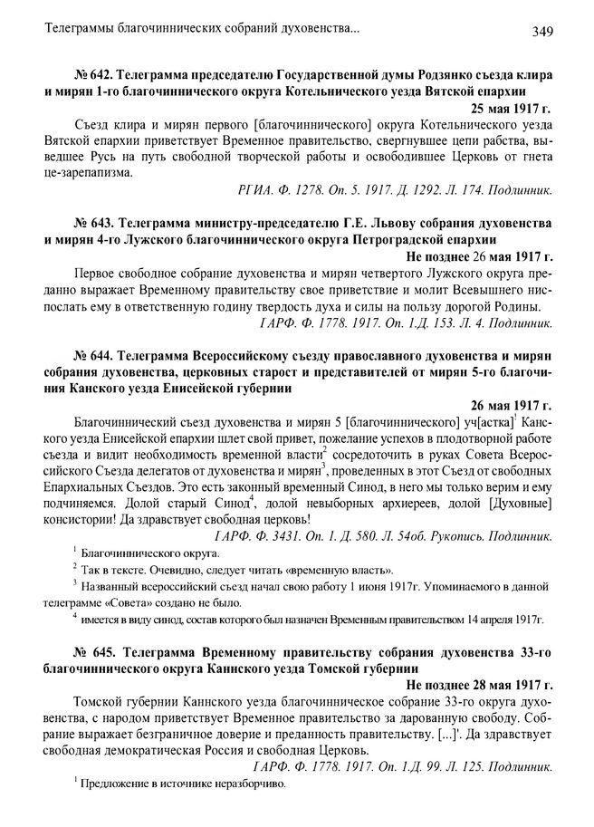 Телеграмма председателю Государственной думы Родзянко съезда клира и мирян 1-го благочиннического округа Котельнического уезда Вятской епархии. 25 мая 1917 г. // РГИА. Ф. 1278. Oп. 5. 1917. Д. 1292. Л. 174. Подлинник.