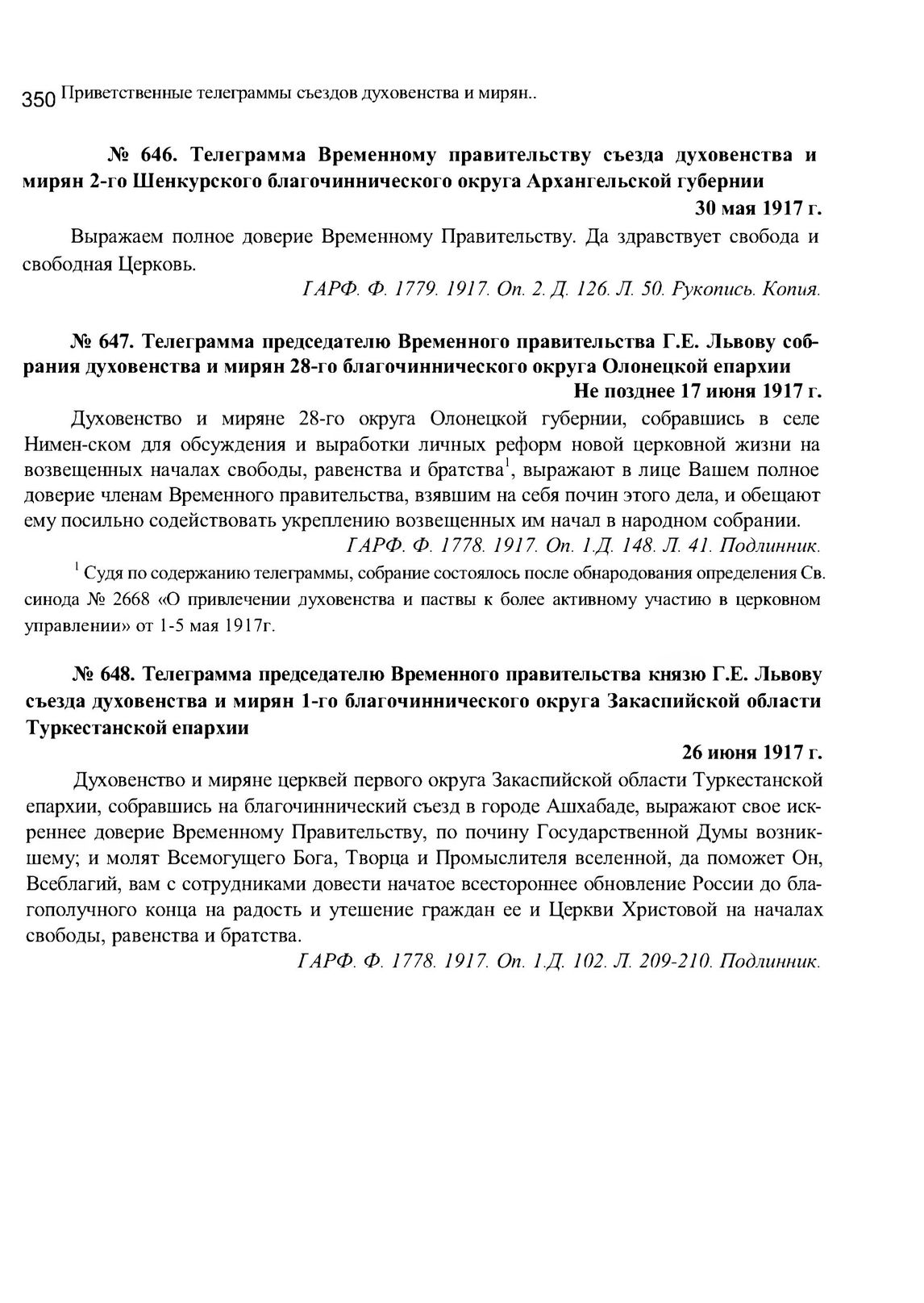 Телеграмма председателю Временного правительства Г.Е. Львову собрания духовенства и мирян 28-го благочиннического округа Олонецкой епархии. Не позднее 17 июня 1917 г. // ГАРФ. Ф. 1778. 1917. Oп. 1. Д. 148. Л. 41. Подлинник.