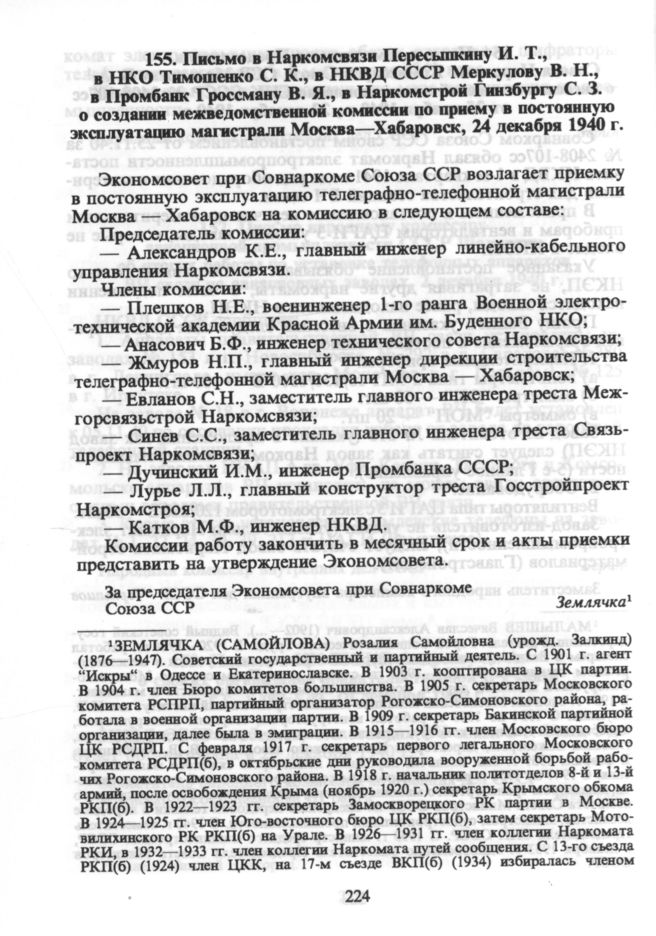 Письмо в Наркомсвязи Пересыпкину И.Т., НКО Тимошенко С.К., НКВД СССР Меркулову В.Н., Промбанк Гроссману В.Я., Наркомстрой Гинзбургу С.3. о создании межведомственной комиссии по приему в постоянную эксплуатацию магистрали Москва--Хабаровск, 24 декабря 1940 г. // ЦОА ФСБ РФ.