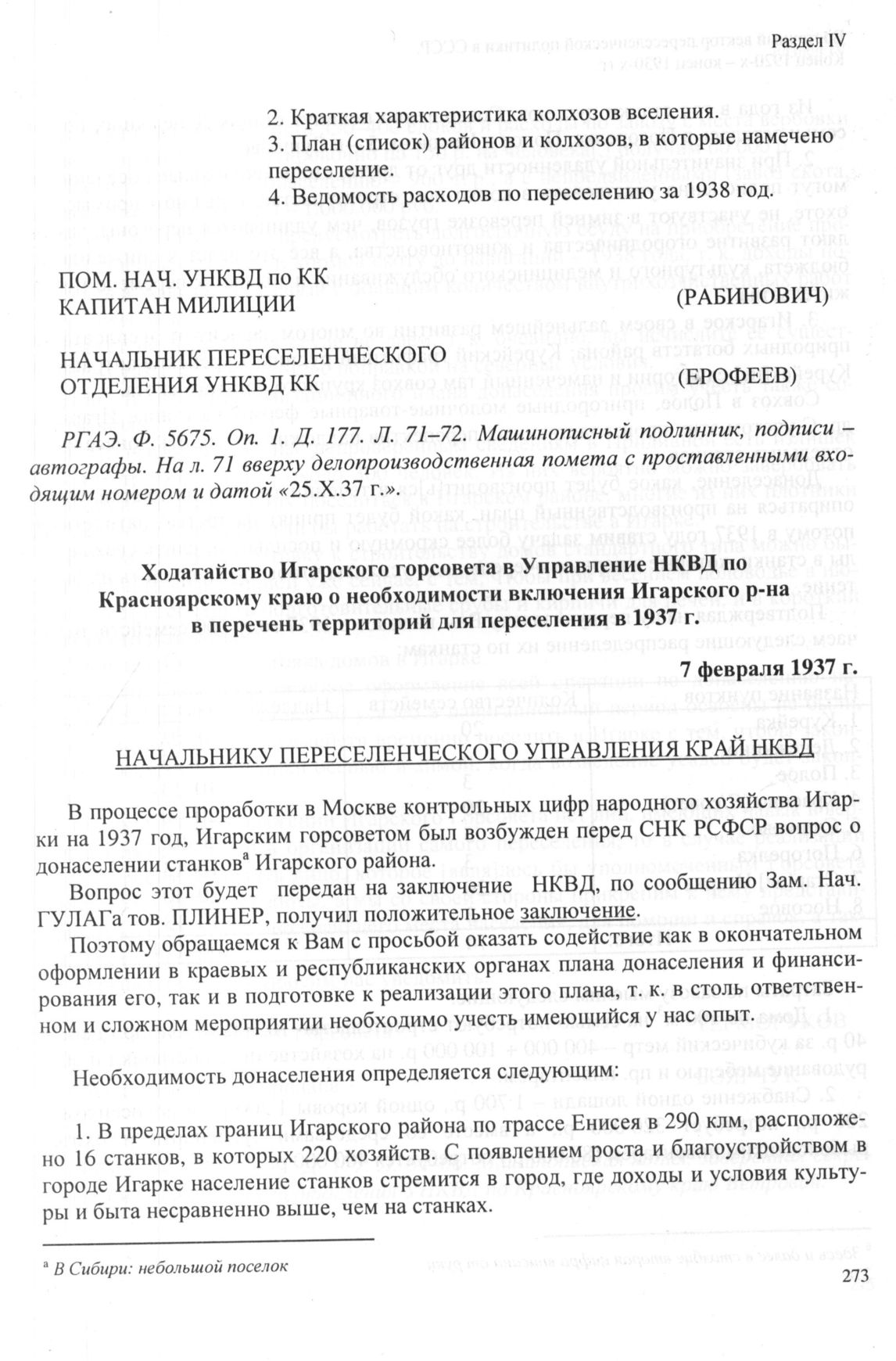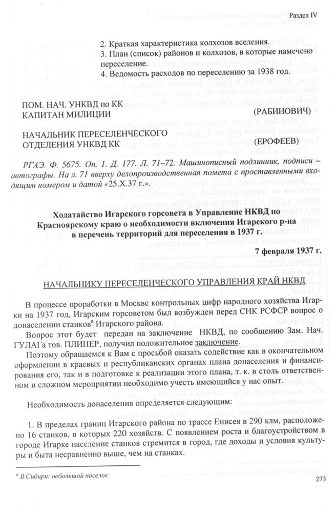 Ходатайство Игарского горсовета в Управление НКВД по Красноярскому краю о необходимости включения Игарского р-на в перечень территорий для переселения в 1937 г. 7 февраля 1937 г. // РГАЭ. Ф. 5675. Oп. 1. Д. 177. Л. 64-66. Машинописная копия, заверенная секретарем переселенческого отделения У НКВД по Красноярскому краю Ветровой.