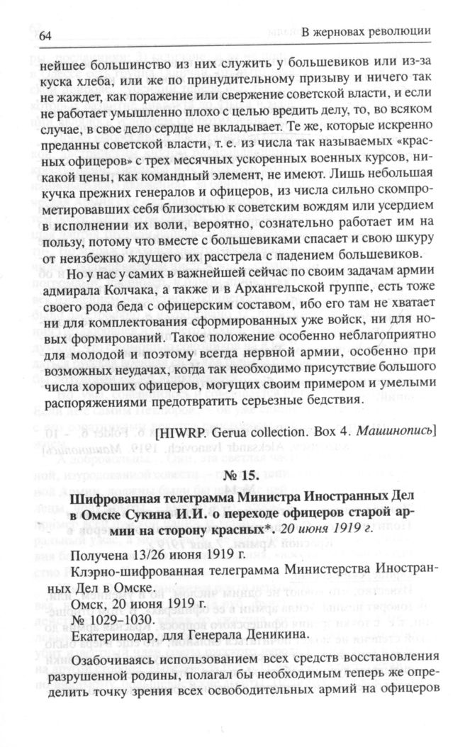 Шифрованная телеграмма Министра Иностранных Дел в Омске Сукина И.И. о переходе офицеров старой армии на сторону красных. 20 июня 1919 г. // HIWRP. Russia - Missia - Greece. Box 14. Машинопись.