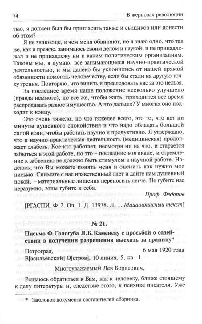 Письмо Ф.Сологуба Л.Б. Каменеву с просьбой о содействии в получении разрешения выехать за границу от 6 мая 1920 г. // РГАСПИ. Ф. 323. Оп. 2. Д. 164. Л. 36-37. Подлинник. Машинопись.