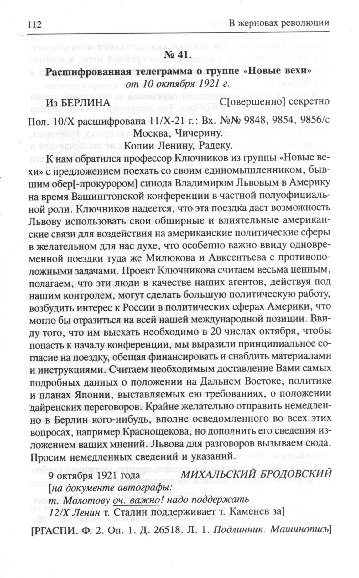 Расшифрованная телеграмма о группе «Новые вехи» от 10 октября 1921 г.