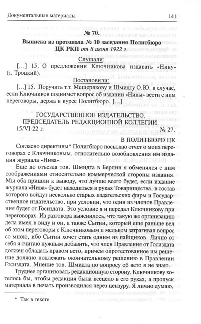 Выписка из протокола № 10 заседания Политбюро ЦК РКП от 8 июня 1922 г. // РГАСПИ. Ф. 5. Оп. 2. Д. 52. Л. 67. Машинописная копия.