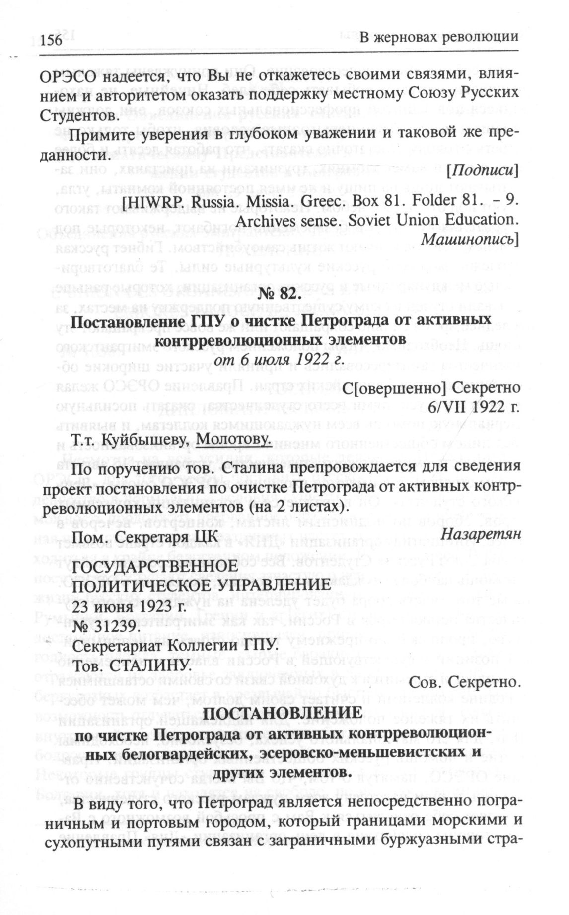 Постановление ГПУ о чистке Петрограда от активных котрреволюционных элементов от 6 июля 1922 г. // РГАСПИ. Ф. 82. Оп. 2. Д. 172. Л. 1-3. Машинопись. Подлинник.