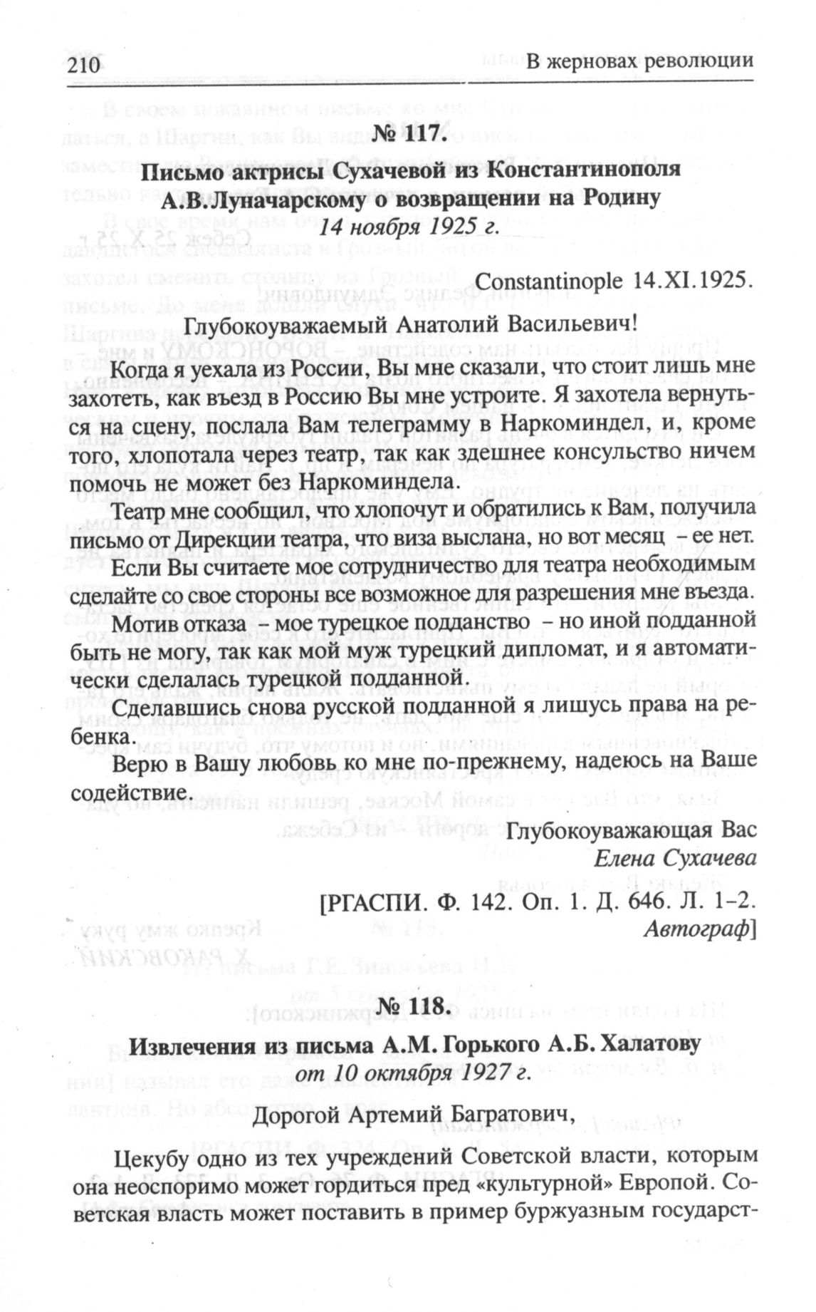 Письмо актрисы Сухачевой из Константинополя А.В. Луначарскому о возвращении на Родину от 14 ноября 1925 г. // РГАСПИ. Ф. 142. Оп. 1. Д. 646. Л. 1-2. Автограф.