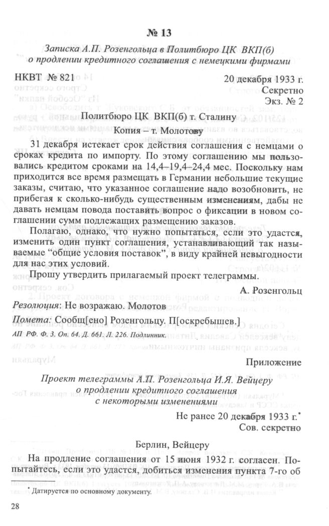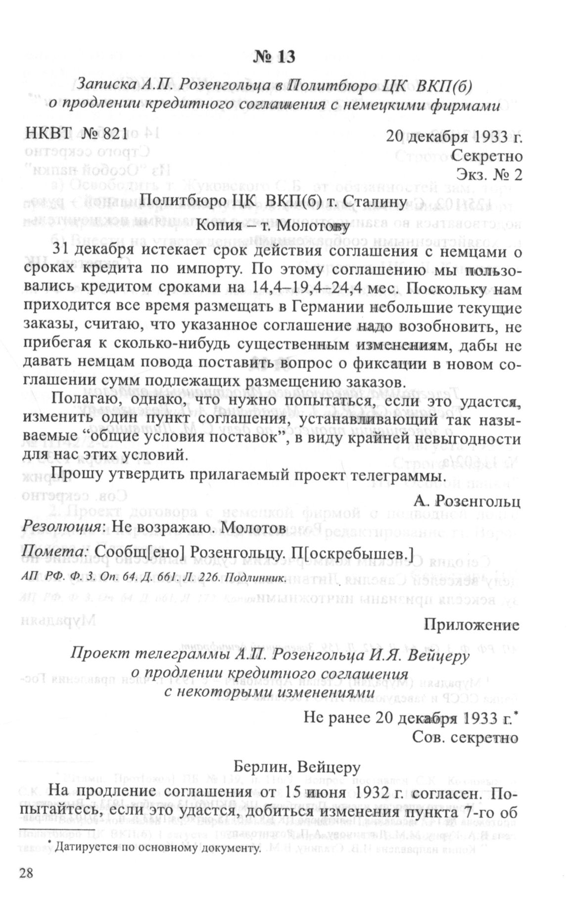 Приложение. Проект телеграммы АЛ. Розенгольца И.Я. Вейцеру о продлении кредитного соглашения с некоторыми изменениями. Не ранее 20 декабря 1933 г. // АП РФ. Ф. 3. Оп. 64. Д. 661. Л. 227. Подлинник.