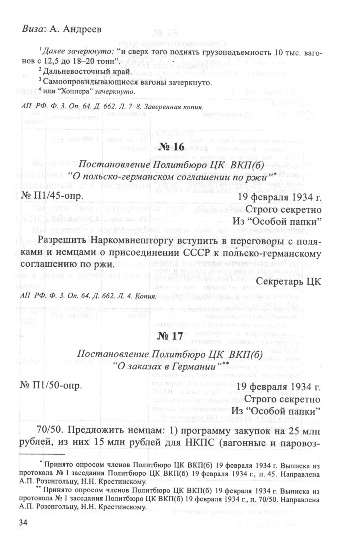 Постановление Политбюро ЦК ВКП(б) “О польско-германском соглашении по ржи”. 19 февраля 1934 г. // АП РФ. Ф. 3. Оп. 64. Д. 662. Л. 4. Копия.