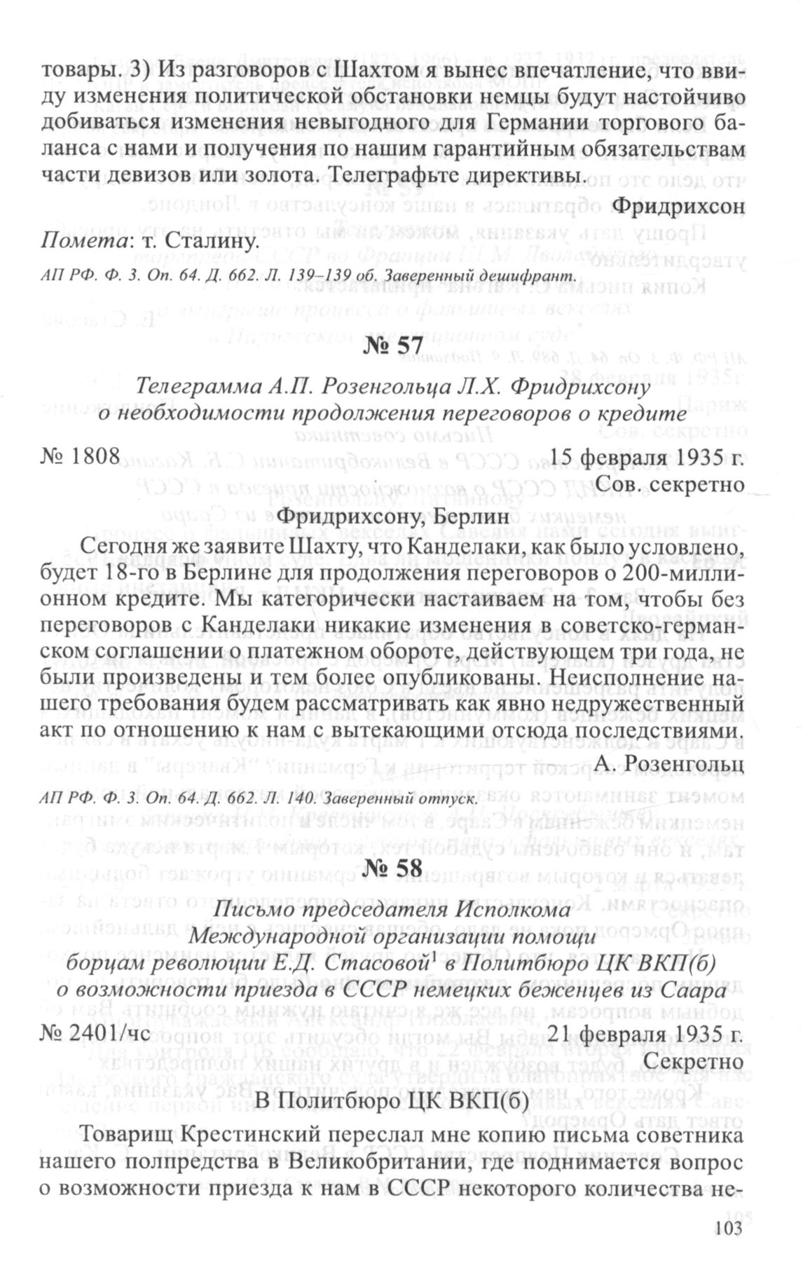 Телеграмма А.П. Розенгольца Л.Х. Фридрихсону о необходимости продолжения переговоров о кредите. 15 февраля 1935 г. // АП РФ. Ф. 3. Oп. 64. Д. 662. Л. 140. Заверенный отпуск.