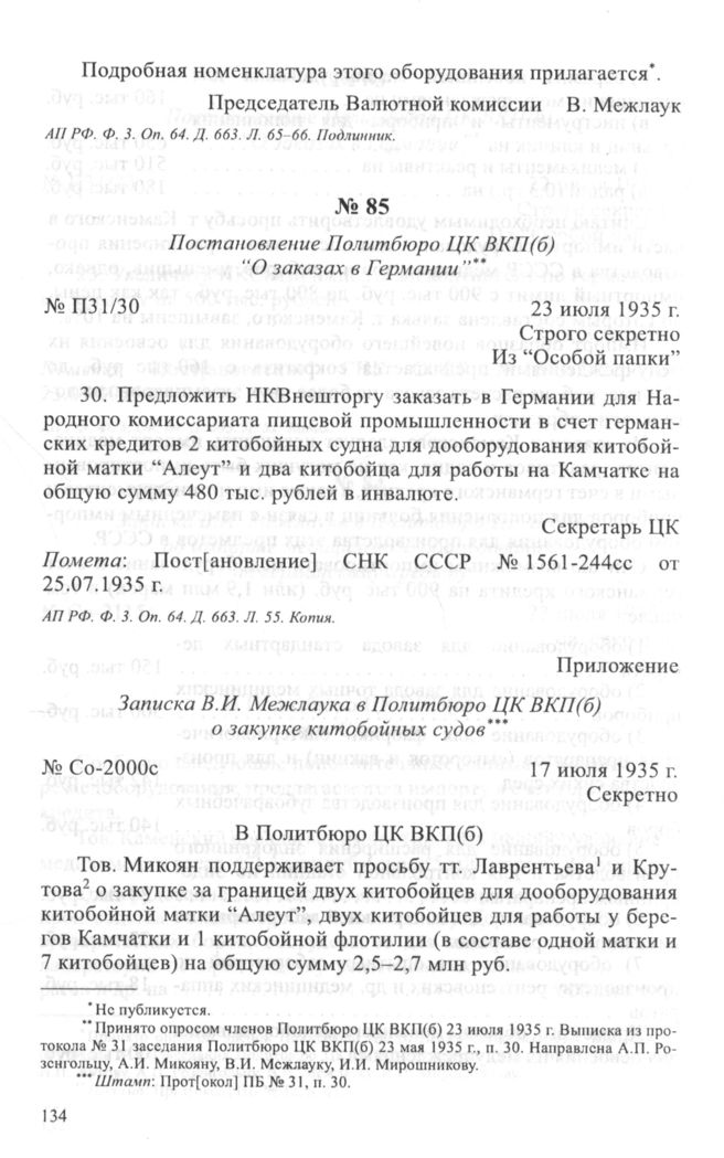 Постановление Политбюро ЦК ВКП(б) “О заказах в Германии . 23 июля 1935 г. // АП РФ. Ф. 3. Oп. 64. Д. 663. Л. 55. Копия.