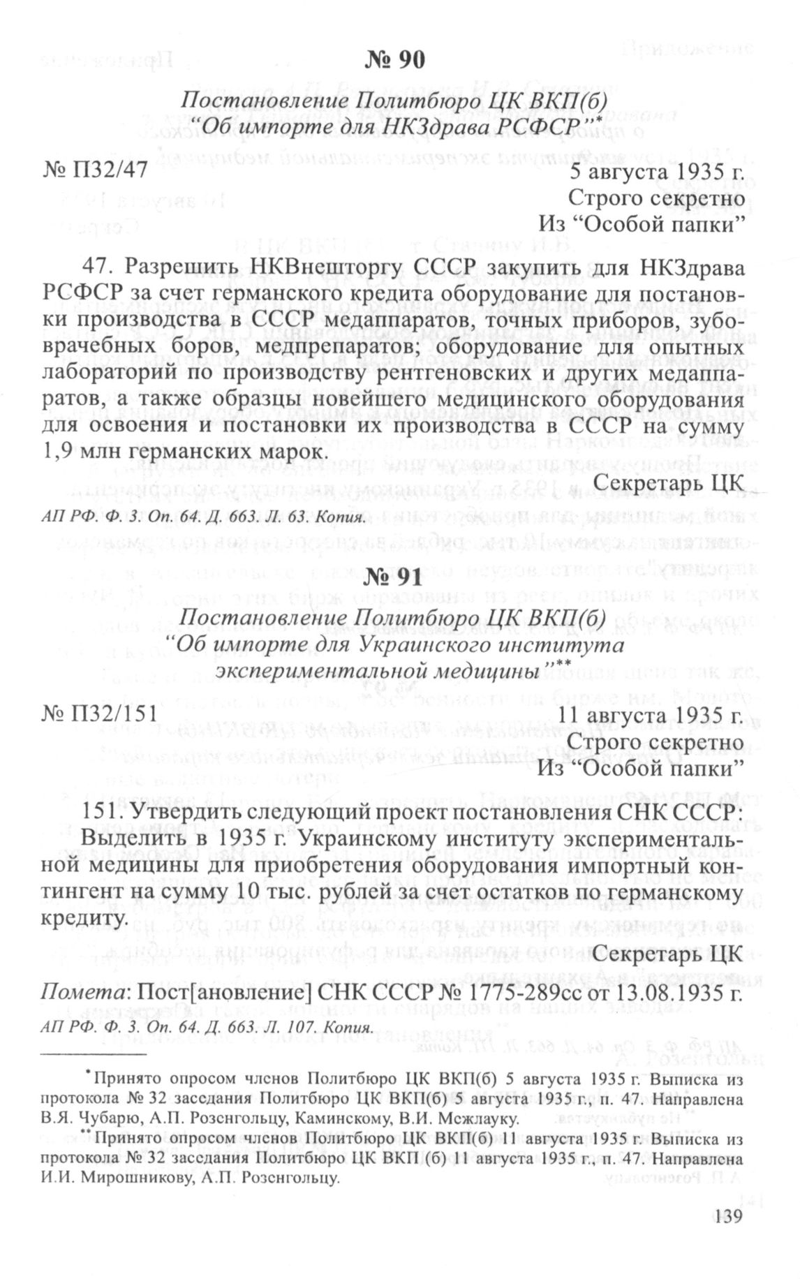 Постановление Политбюро ЦК ВКП(б) “Об импорте для НКЗдрава РСФСР”. 5 августа 1935 г. // АП РФ. Ф. 3. Oп. 64. Д. 663. Л. 63. Копия.