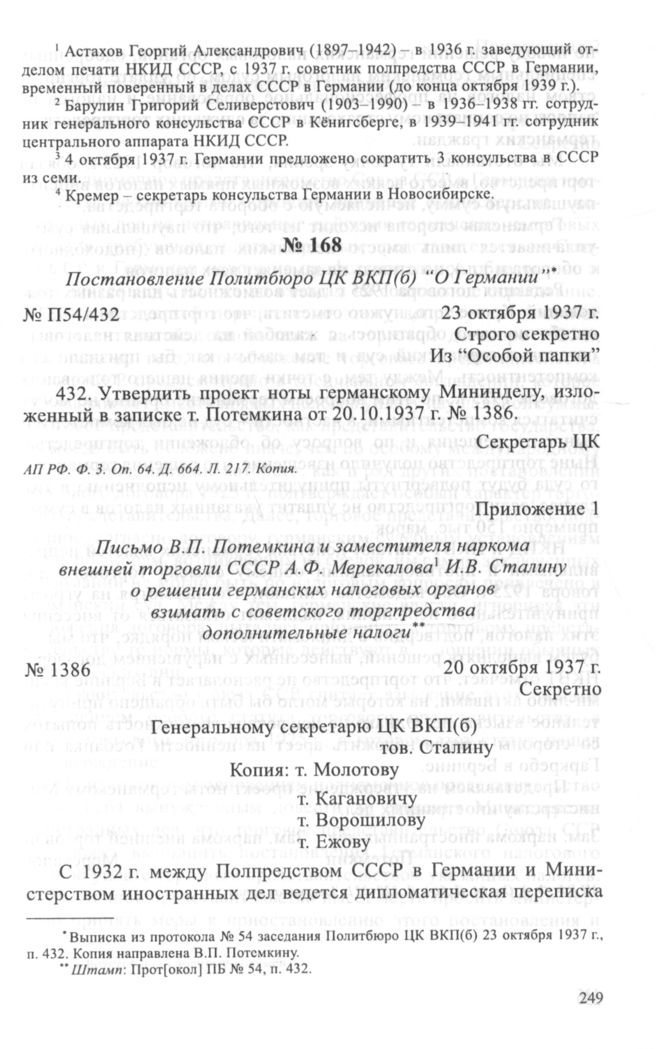 Приложение 1. Письмо В.П. Потемкина и заместителя наркома внешней торговли СССР А. Ф. Мерекалова И.В. Сталину о решении германских налоговых органов взимать с советского торгпредства дополнительные налоги. 20 октября 1937 г.