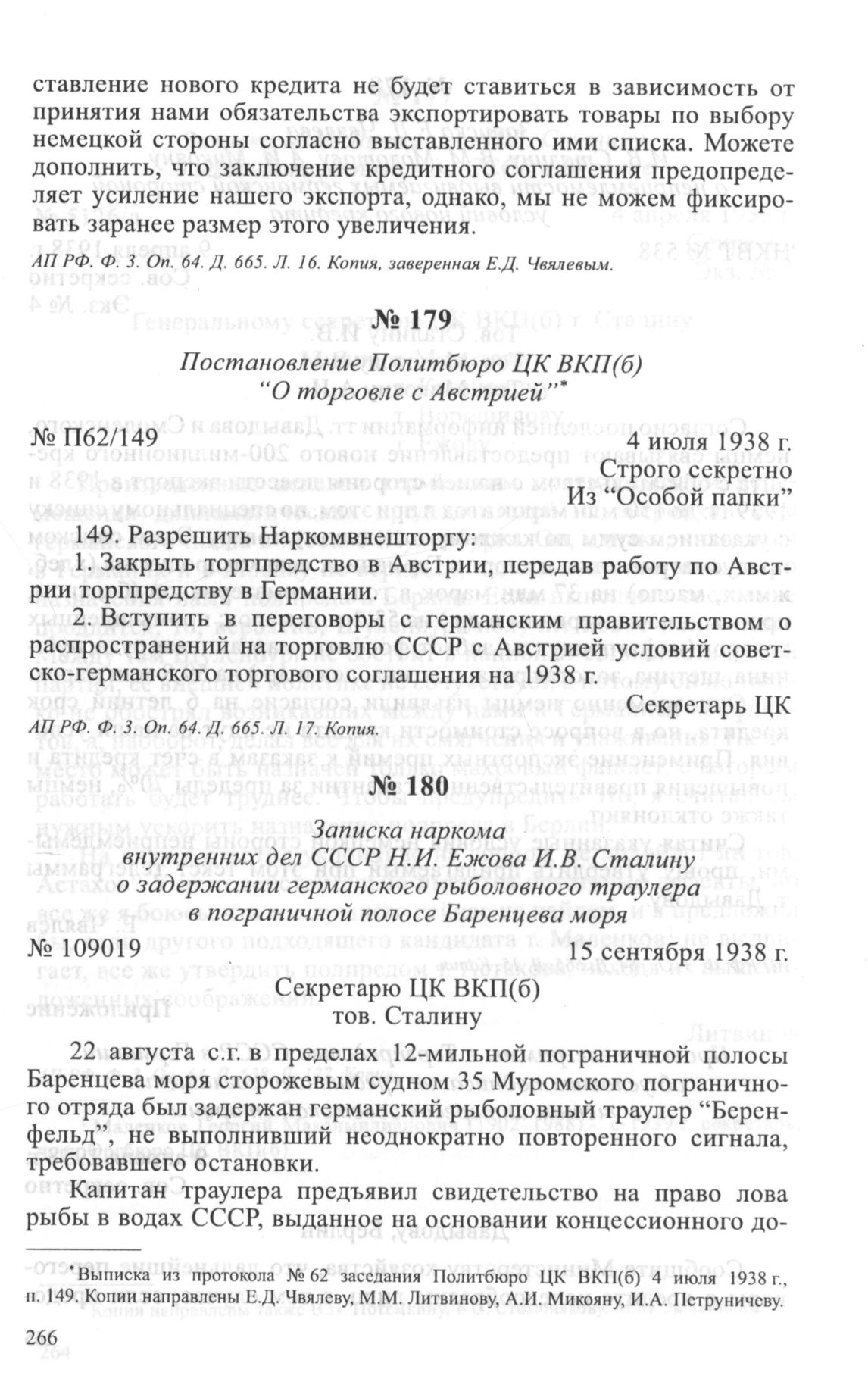 Постановление Политбюро ЦК ВКП(б) “О торговле с Австрией”. 4 июля 1938 г. // АП РФ. Ф. 3. Оп. 64. Д. 665. Л. 17. Копия.