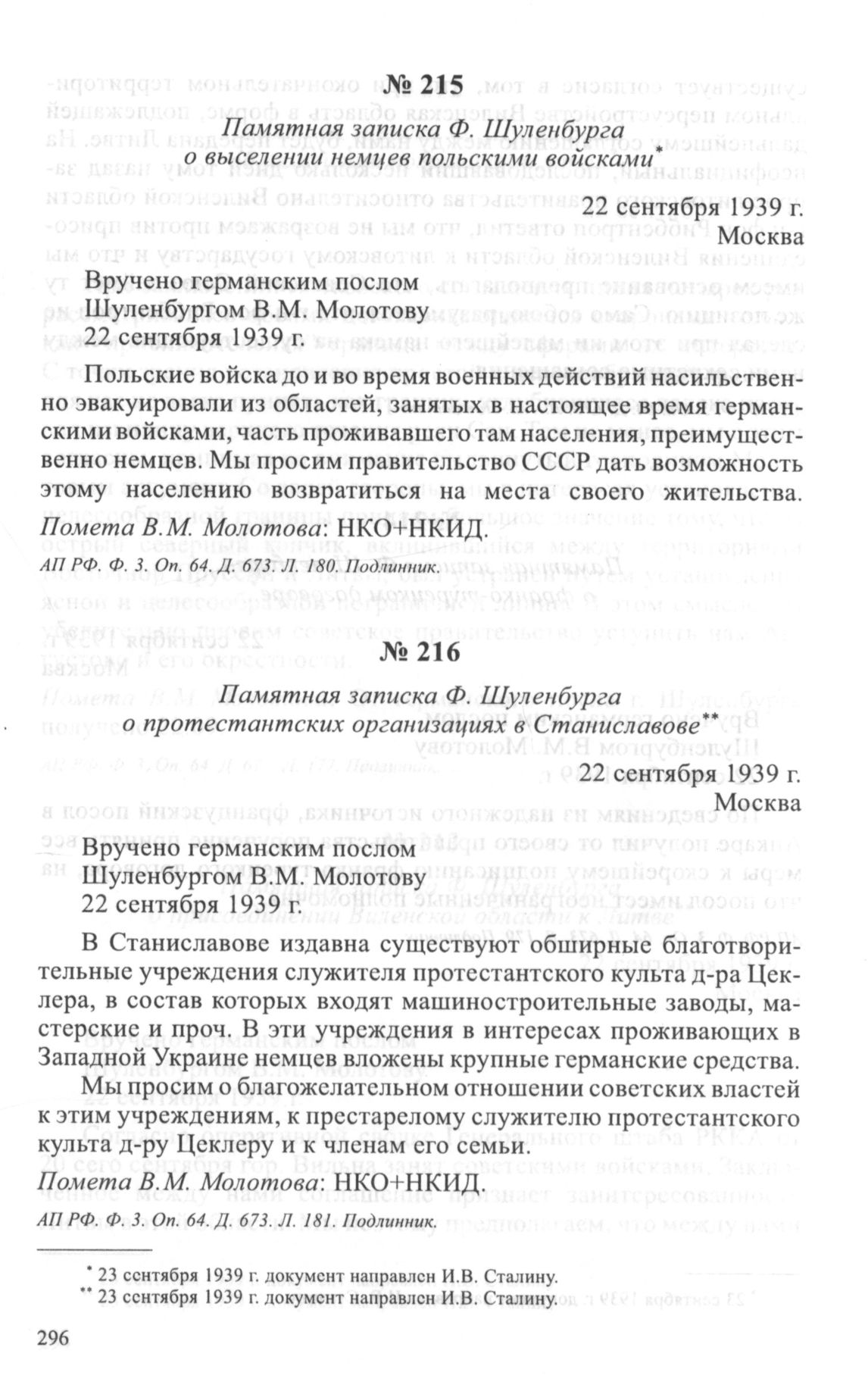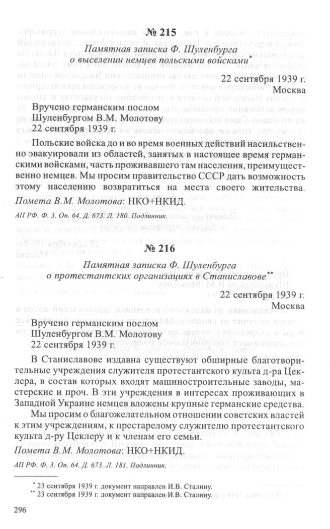 Памятная записка Ф. Шуленбурга о выселении немцев польскими войсками. 22 сентября 1939 г. // АП РФ. Ф. 3. Oп. 64. Д. 673. Л. 180. Подлинник.