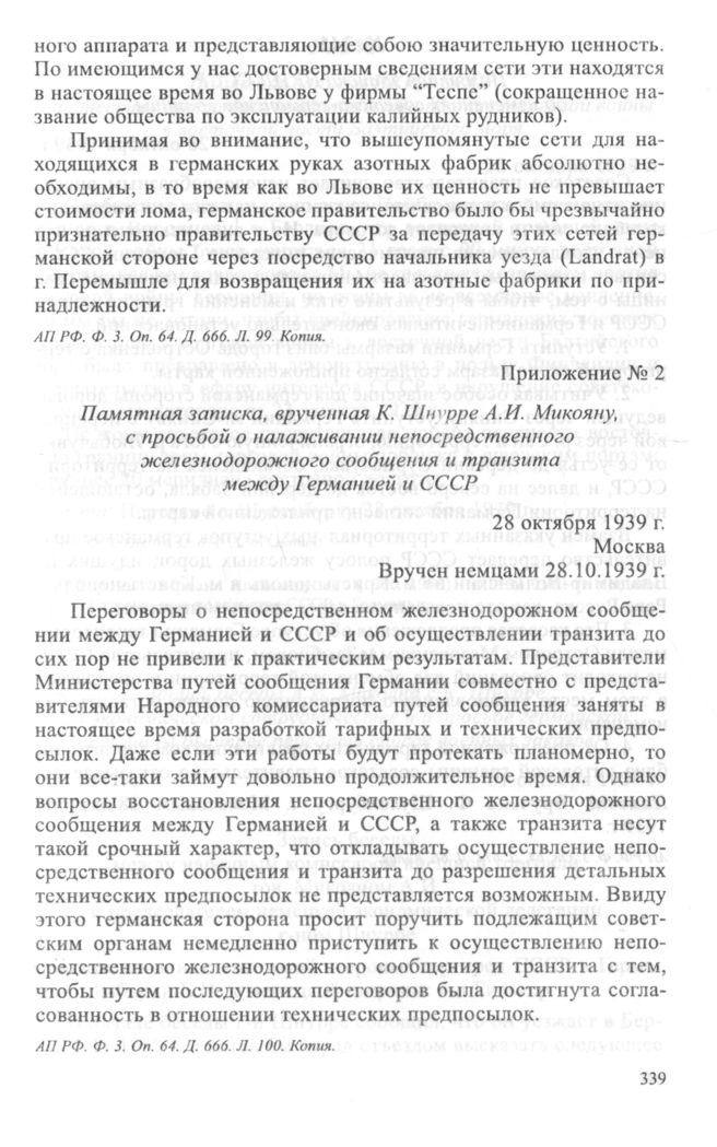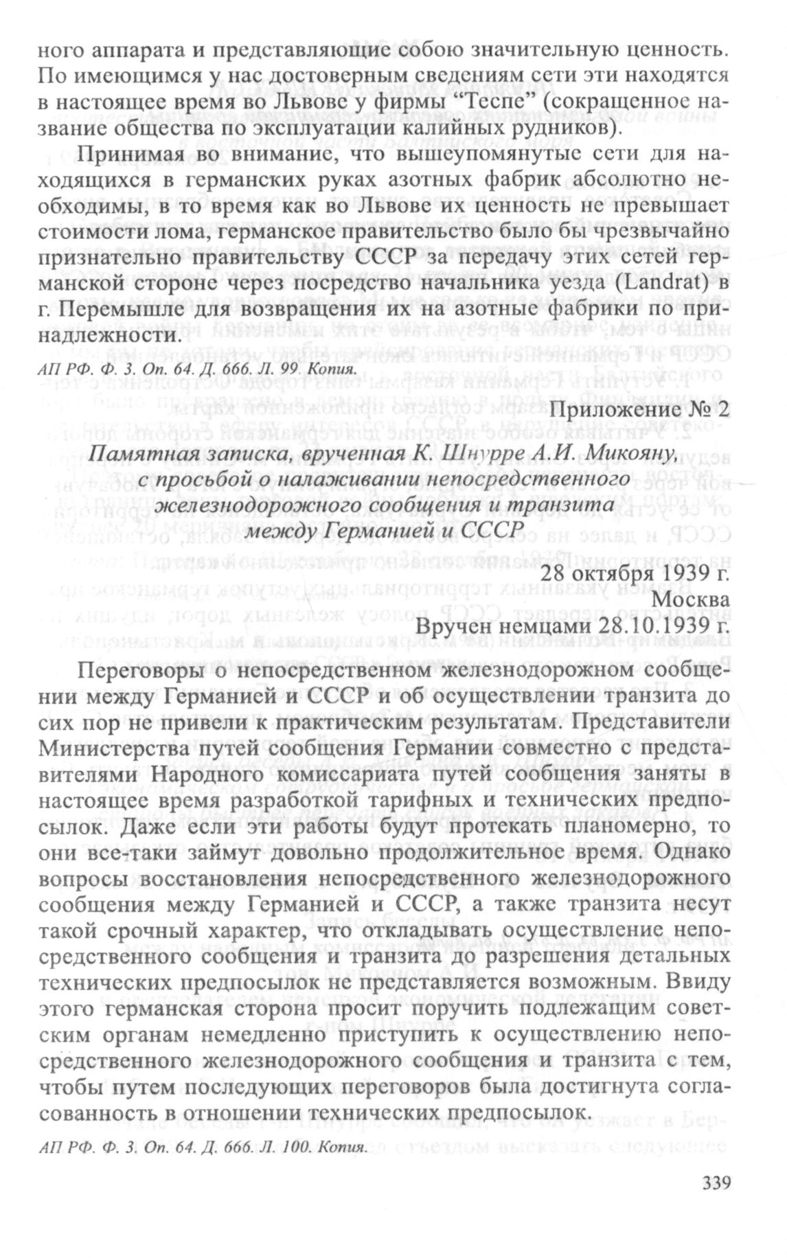 Приложение № 2. Памятная записка, врученная К. Шнурре А.И. Микояну, с просьбой о налаживании непосредственного железнодорожного сообщения и транзита между Германией и СССР. 28 октября 1939 г. // АП РФ. Ф. 3. Oп. 64. Д. 666. Л. 100. Копия.