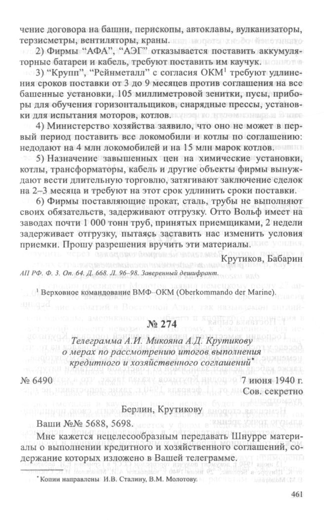 Телеграмма А.И. Микояна А.Д. Крутикову о мерах по рассмотрению итогов выполнения кредитного и хозяйственного соглашений. 7 июня 1940 г. // АП РФ. Ф. 3. Оп. 64. Д. 668. Л. 99-100. Заверенный отпуск.