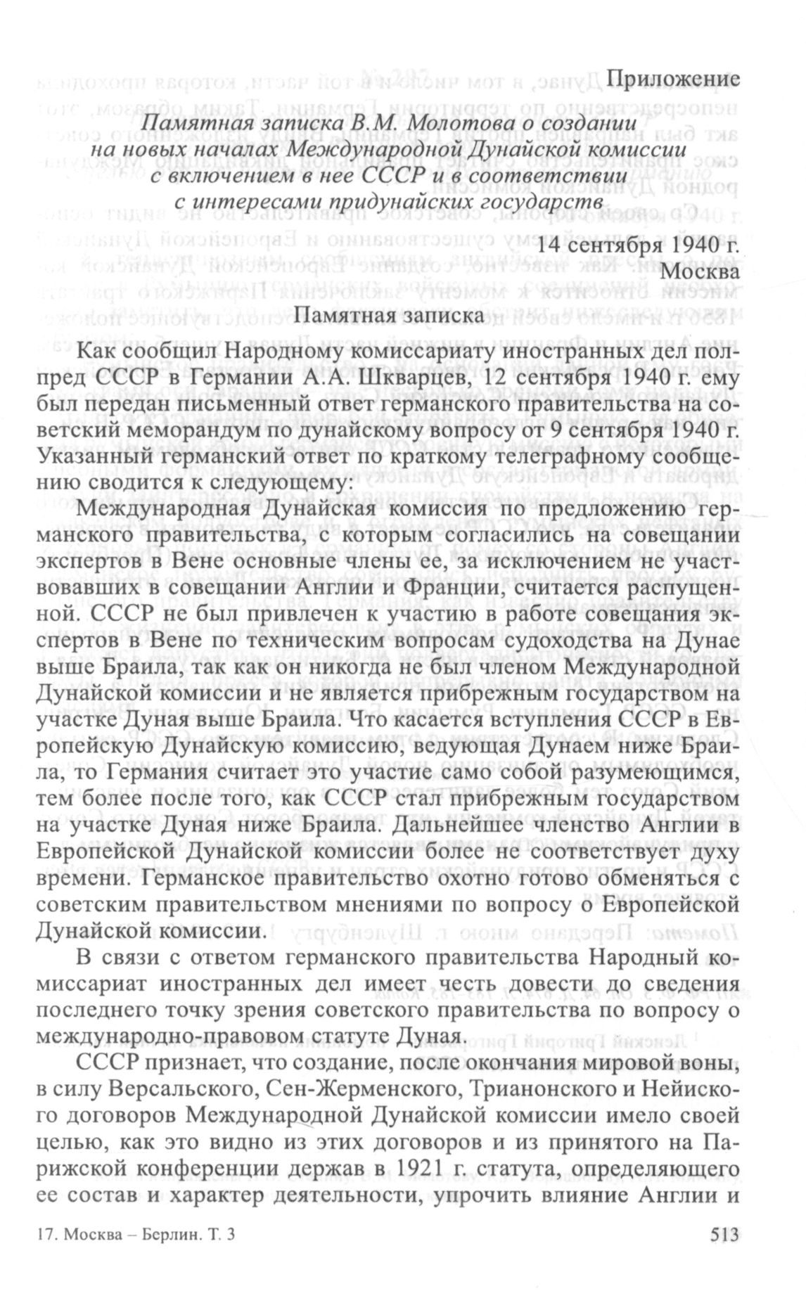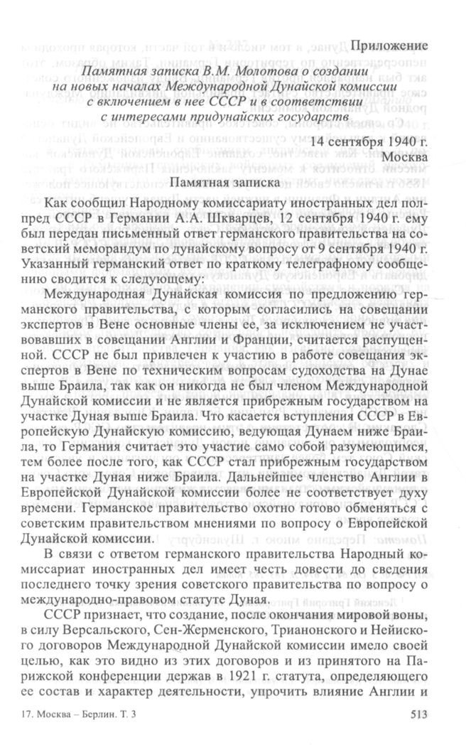 Приложение. Памятная записка В.М. Молотова о создании на новых началах Международной Дунайской комиссии с включением в нее СССР и в соответствии с интересами придунайских государств. 14 сентября 1940 г.