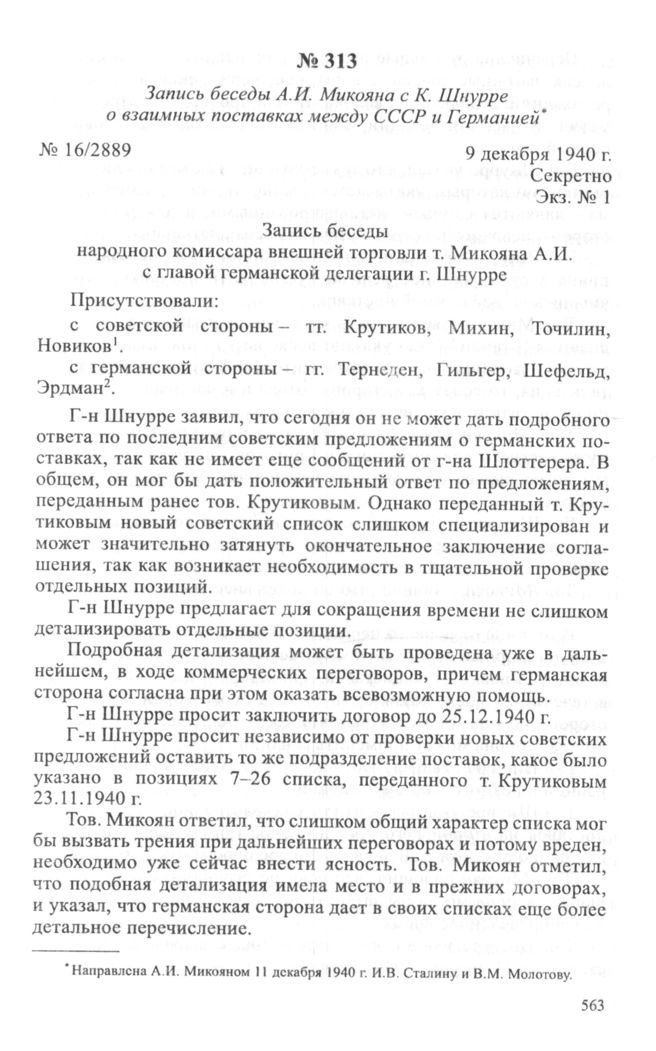 Запись беседы А.И. Микояна с К. Шнурре о взаимных поставках между СССР и Германией. 9 декабря 1940 г. // АП РФ. Ф. 3. Оп. 64. Д. 675. Л. 118. Подлинник.