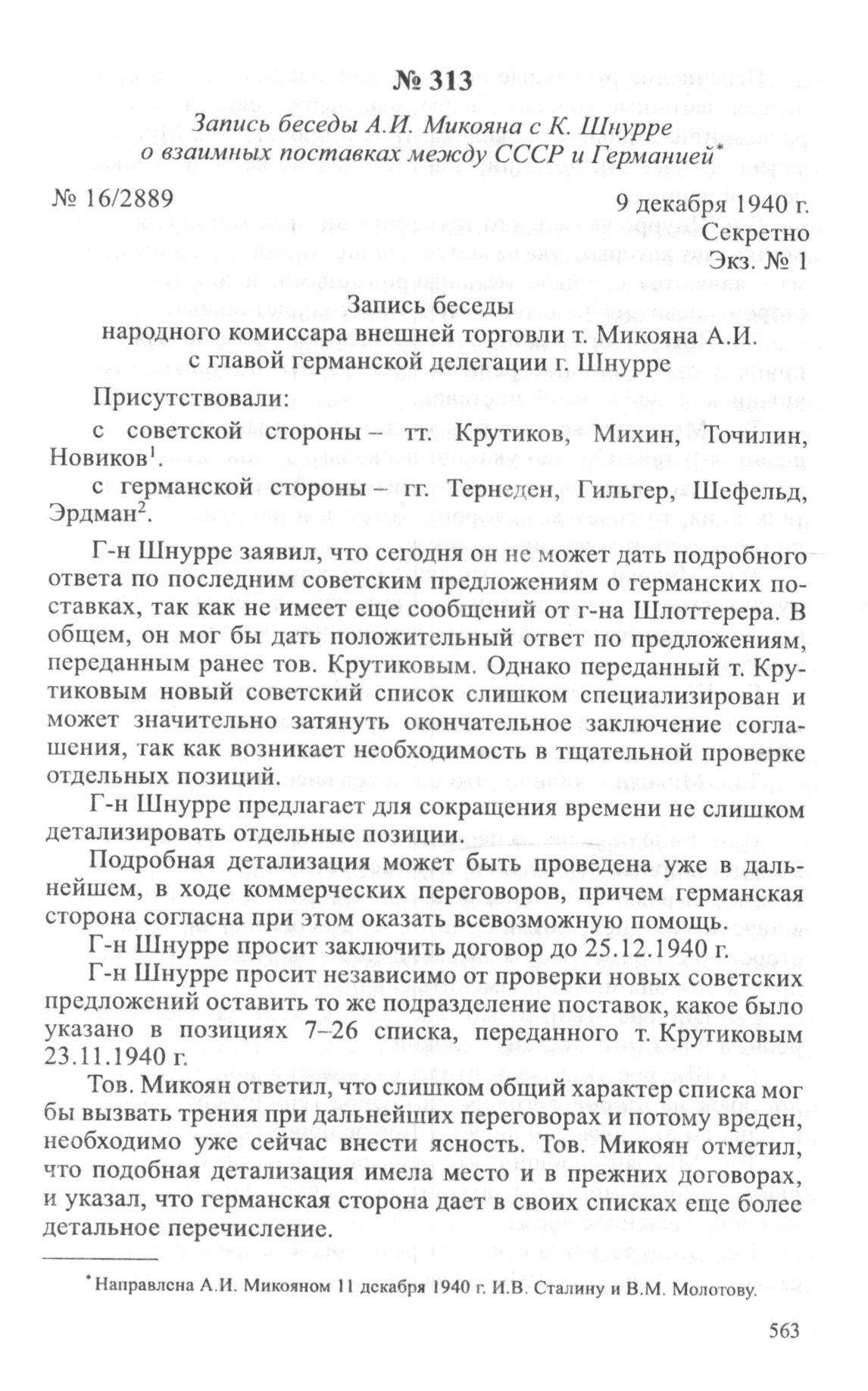 Запись беседы А.И. Микояна с К. Шнурре о взаимных поставках между СССР и Германией. 9 декабря 1940 г.