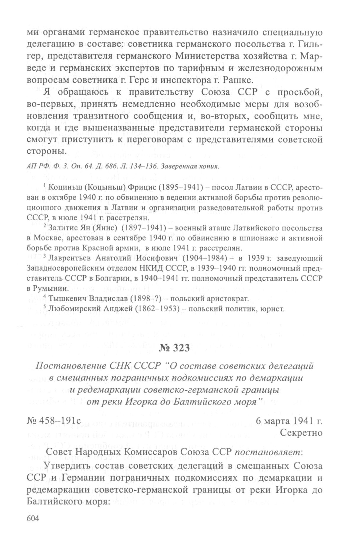 Постановление СНК СССР “О составе советских делегаций в смешанных пограничных подкомиссиях по демаркации и редемаркации советско-германской границы от реки Игарка до Балтийского моря”. 6 марта 1941 г.