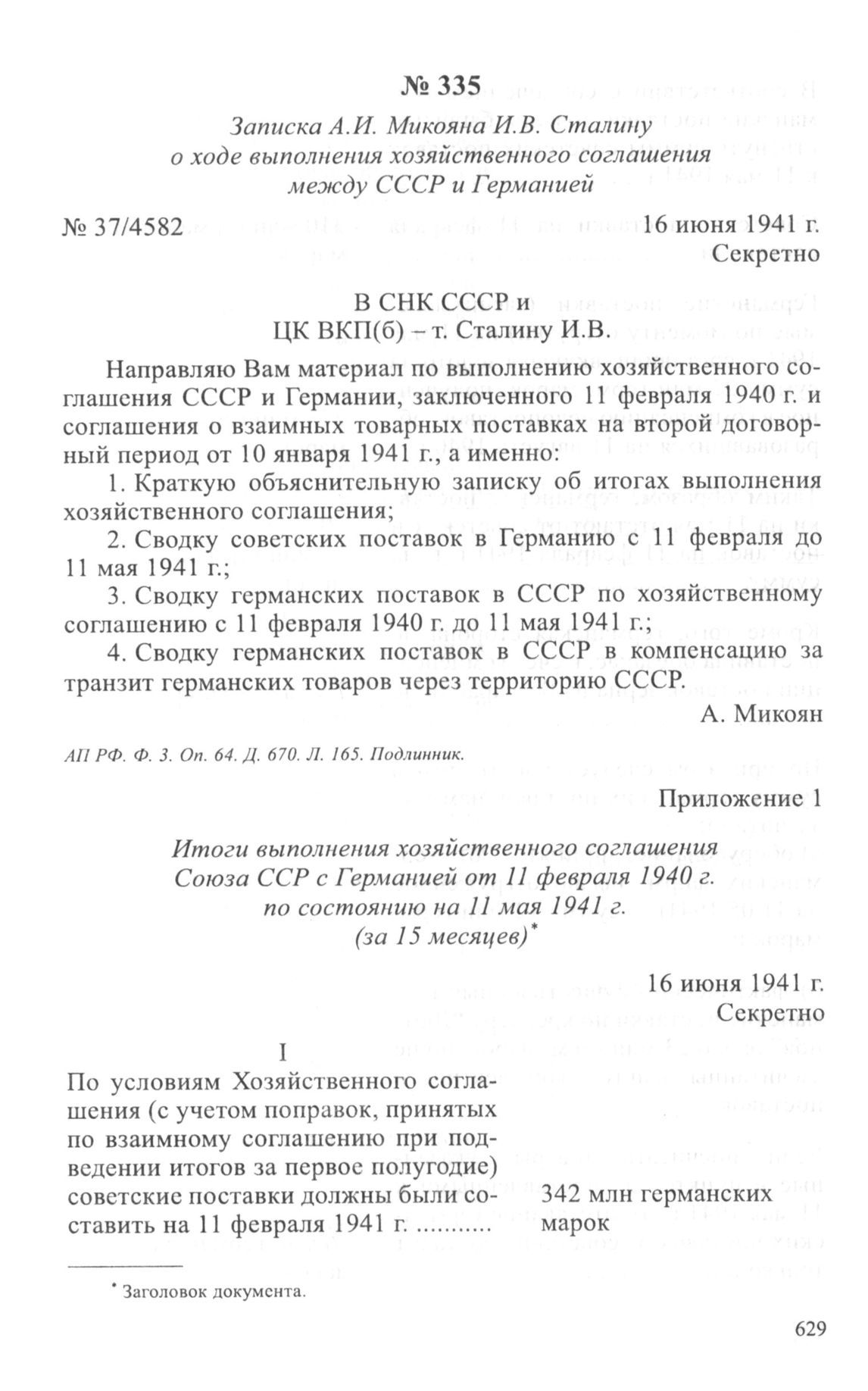 Записка А.И. Микояна И.В. Сталину о ходе выполнения хозяйственного соглашения между СССР и Германией. 16 июня 1941 г. // АП РФ. Ф. 3. Oп. 64. Д. 670. Л. 165. Подлинник.
